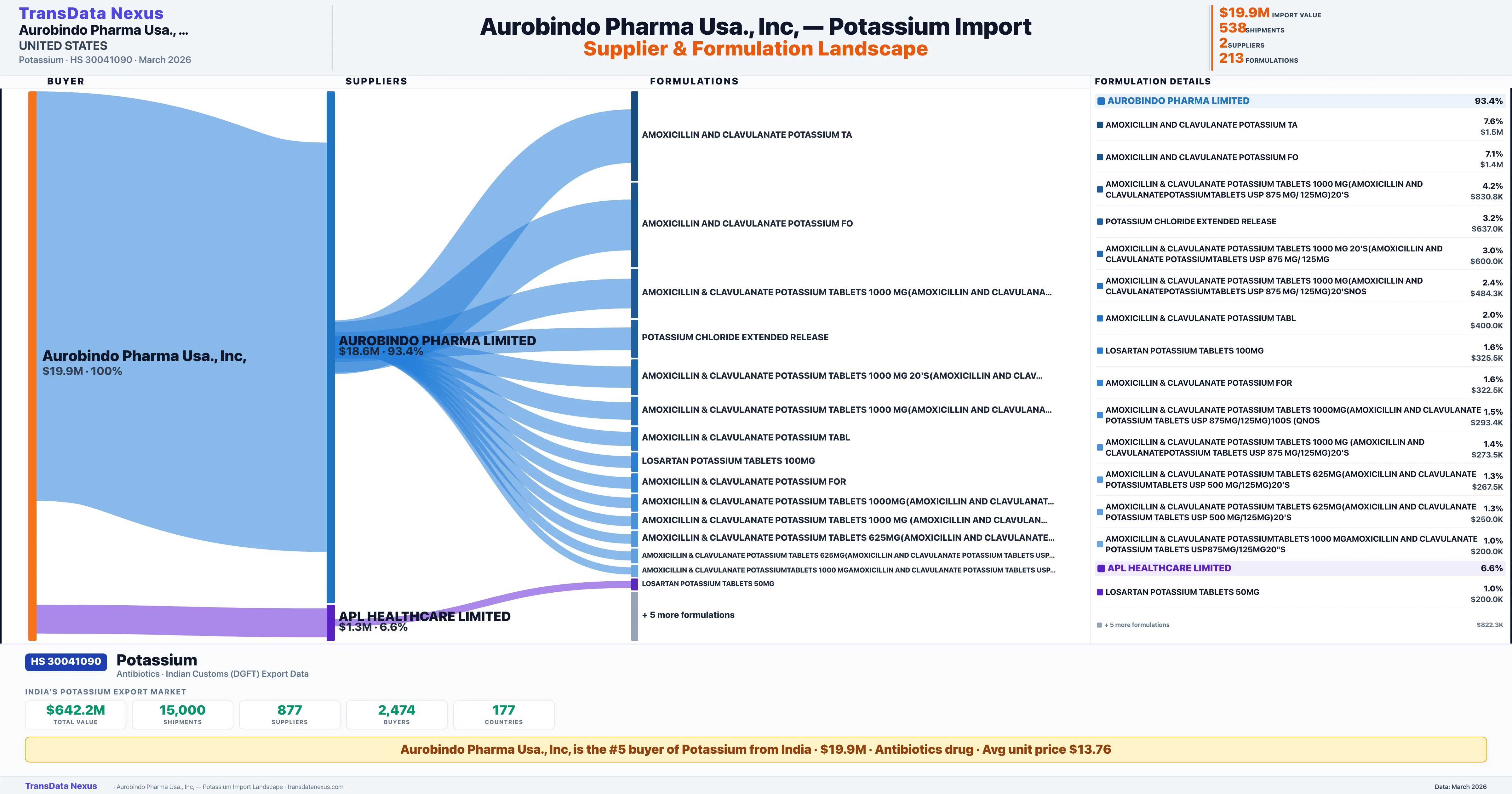 AUROBINDO PHARMA USA INC sources Potassium from 2 verified Indian suppliers: AUROBINDO PHARMA LIMITED ($18.6M, 93.4%), APL HEALTHCARE LIMITED ($1.3M, 6.6%). This is based on 538 customs records.
