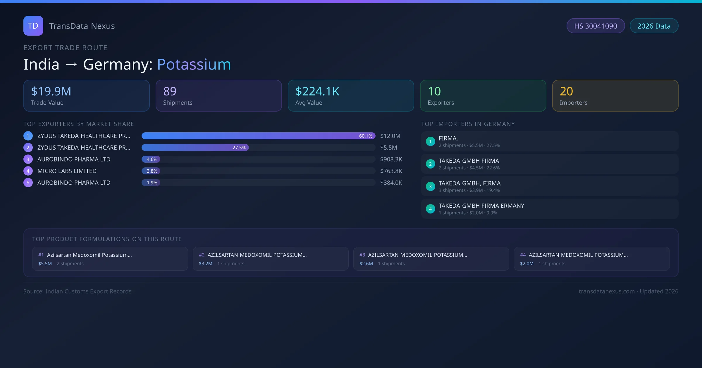 The India to Germany Potassium corridor is one of India's established pharmaceutical export routes, with 89 shipments documented worth a combined $19.9M USD. The route is dominated by ZYDUS TAKEDA HEALTHCARE PRIVATE LIMITED, which alone accounts for roughly 60% of all export value, reflecting the consolidated nature of India's potassium manufacturing sector.