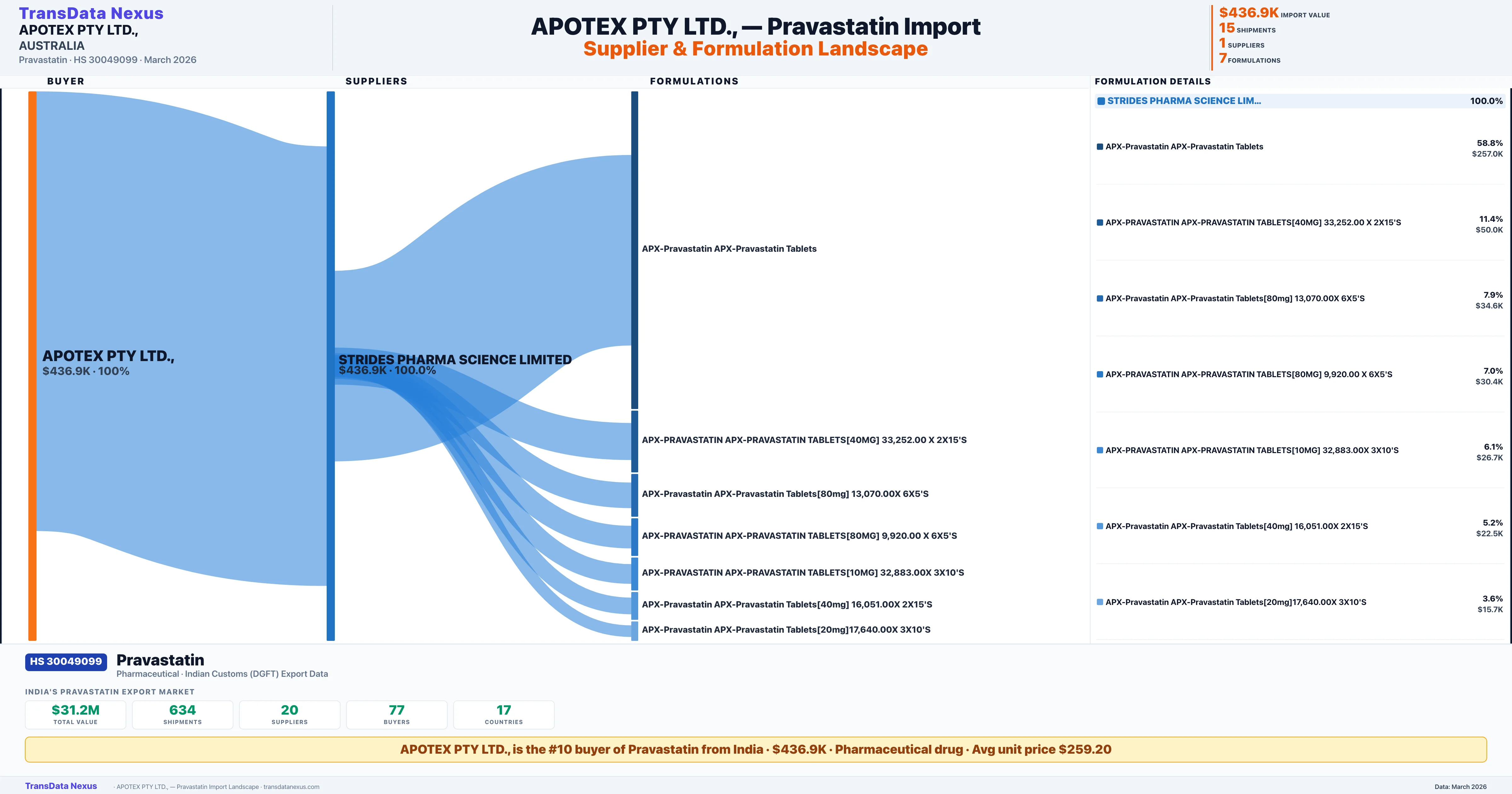 APOTEX PTY LTD., sources Pravastatin from 1 verified Indian supplier: STRIDES PHARMA SCIENCE LIMITED ($436.9K, 100.0%). This is based on 15 customs records.
