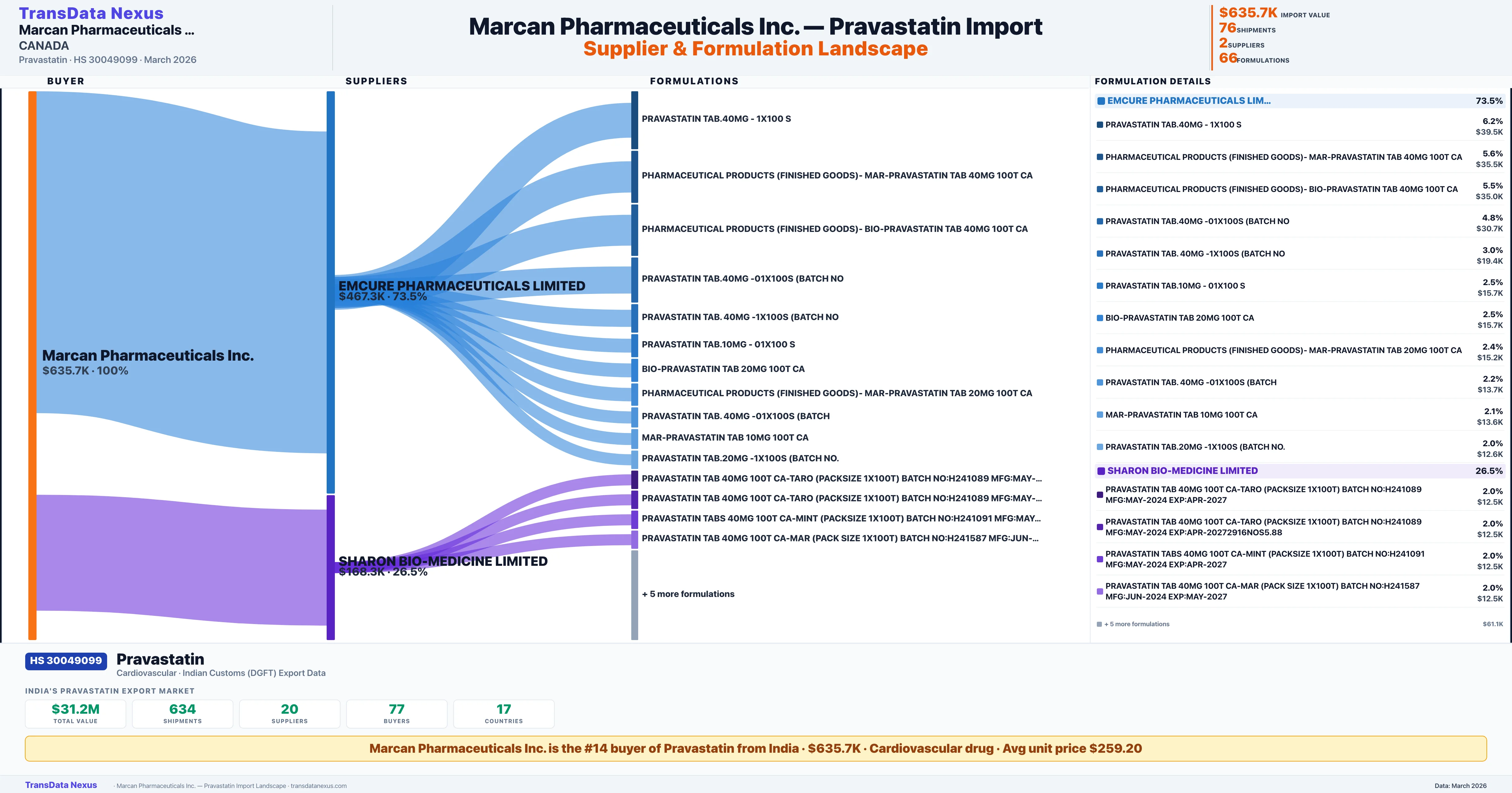 MARCAN PHARMACEUTICALS INC. sources Pravastatin from 2 verified Indian suppliers: EMCURE PHARMACEUTICALS LIMITED ($467.3K, 73.5%), SHARON BIO-MEDICINE LIMITED ($168.3K, 26.5%). This is based on 76 customs records.