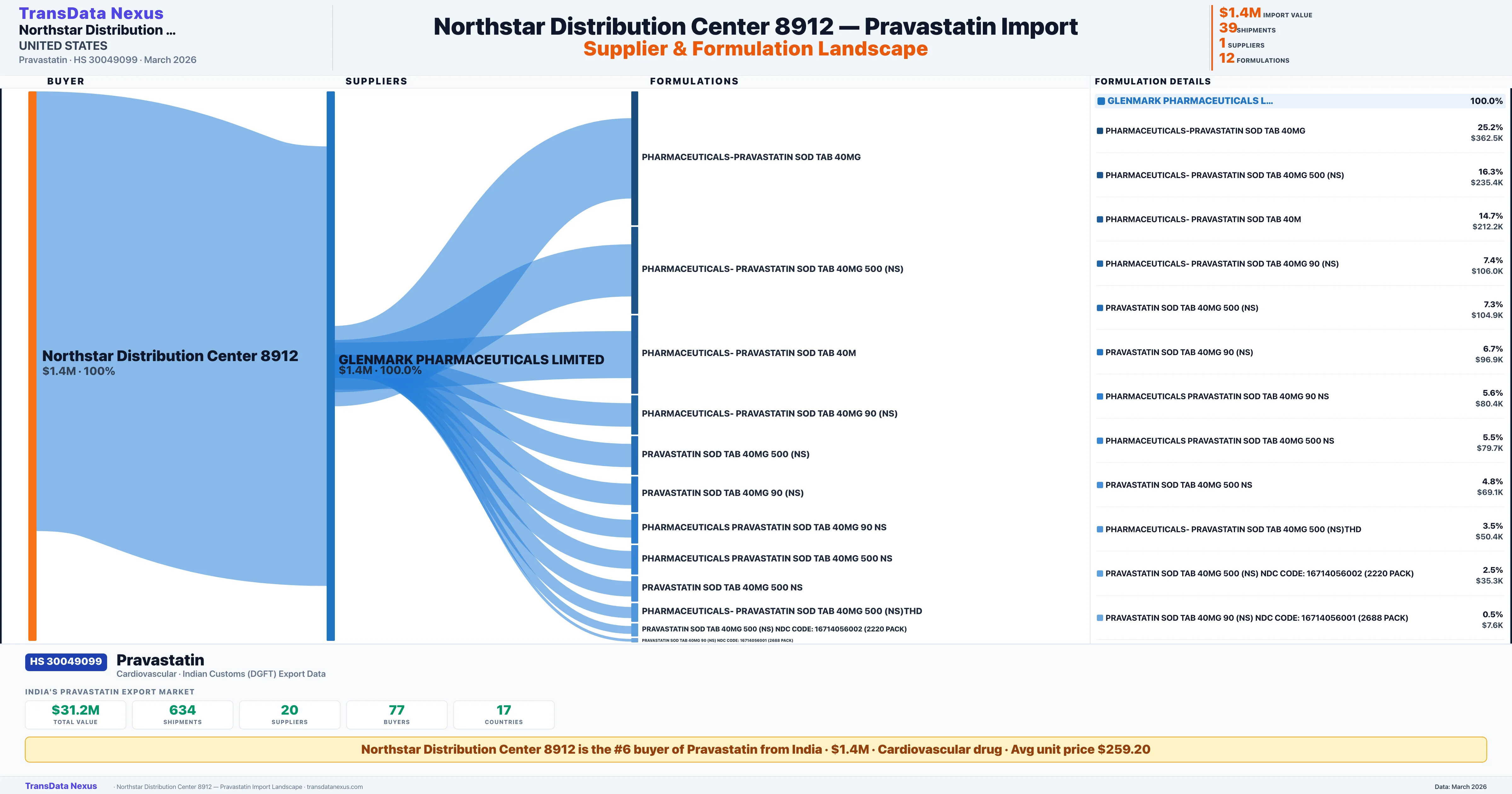 NORTHSTAR DISTRIBUTION CENTER 8912 sources Pravastatin from 1 verified Indian supplier: GLENMARK PHARMACEUTICALS LIMITED ($1.4M, 100.0%). This is based on 39 customs records.