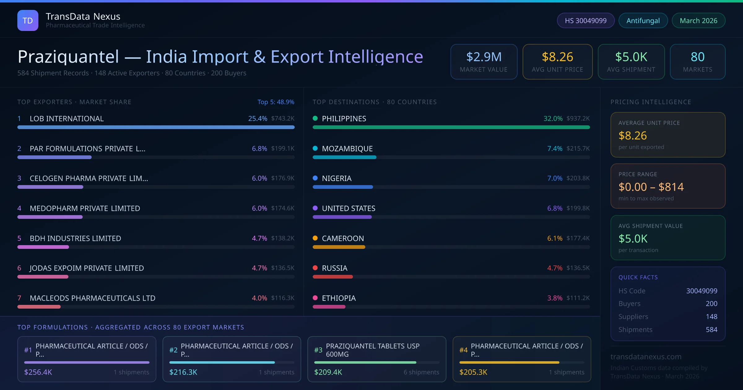 Between 2022 and 2026, India exported $2.9M worth of praziquantel across 584 verified shipments to 80 countries — covering 41% of world markets in the Antimalarial & Antiparasitic segment. The largest destination is PHILIPPINES (32.0%). LOB INTERNATIONAL leads with a 25.4% share. All figures are drawn from Indian Customs (DGFT) shipping bill records spanning four years of trade activity.