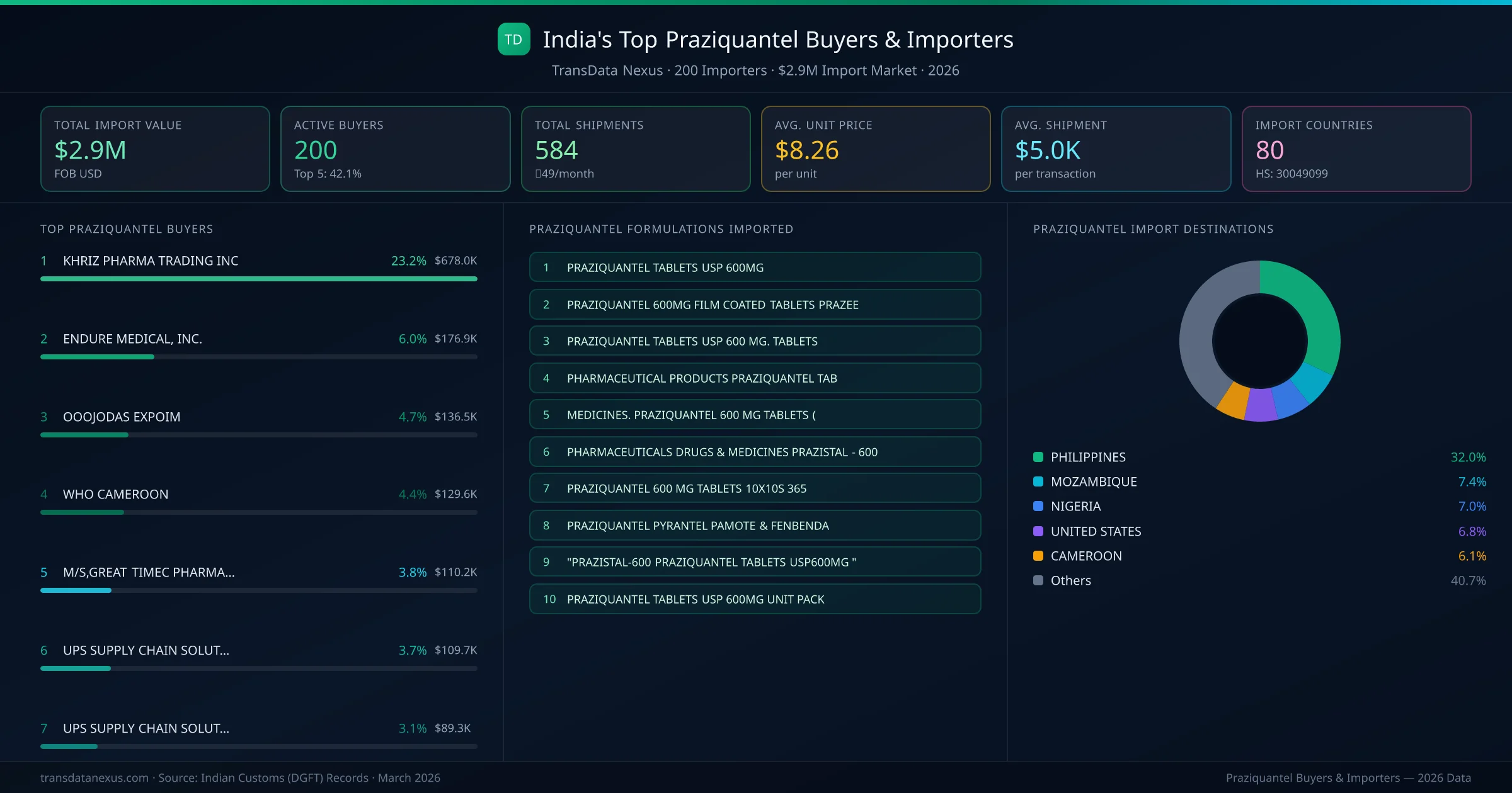 There are 200 active praziquantel buyers importing from India, with a combined market of $2.9M across 584 shipments to 80 countries. The top 5 buyers hold 39.8% of total import value, while the remaining 195 buyers handle the other 60.2%.