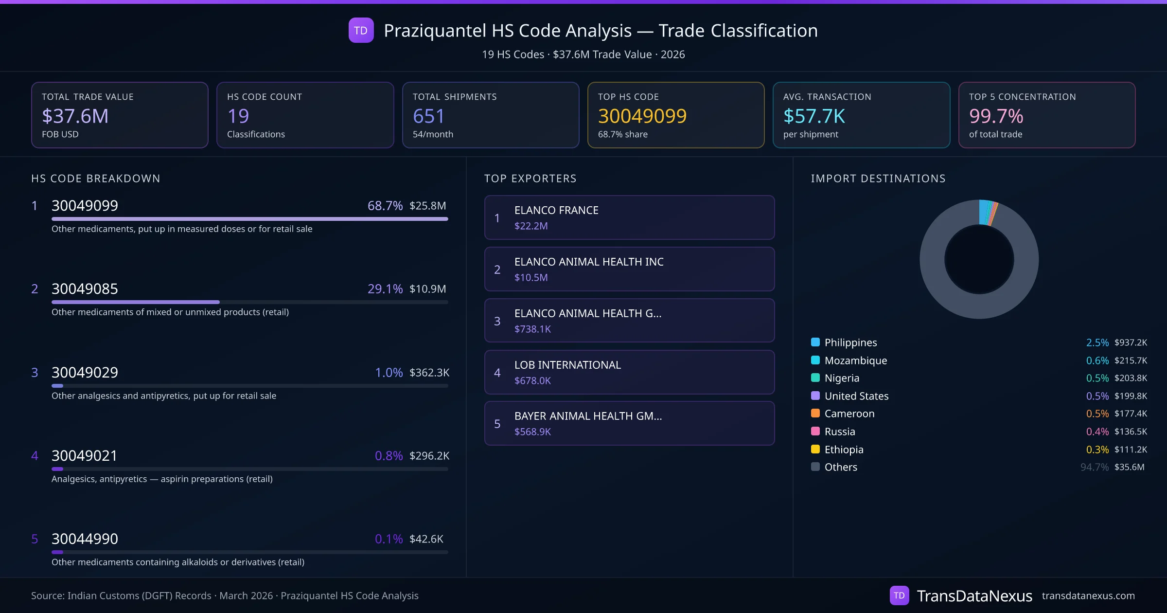 India exports Praziquantel under 19 distinct HS code classifications, representing a total trade value of $37.6M across 651 shipments. The dominant classification is HS 30049099 (Other medicaments, put up in measured doses or for retail sale), accounting for 68.7% of all Praziquantel trade at $25.8M. HS 30049085 (Other medicaments of mixed or unmixed products (retail)) follows at 29.1% ($10.9M). The top 5 HS codes together account for 99.7% of total Praziquantel trade from India. The average transaction value is $57695. Key importing markets include Philippines, Mozambique, Nigeria. Leading exporters include ELANCO FRANCE and ELANCO ANIMAL HEALTH INC. Data sourced from Indian Customs (DGFT) shipping bill records.