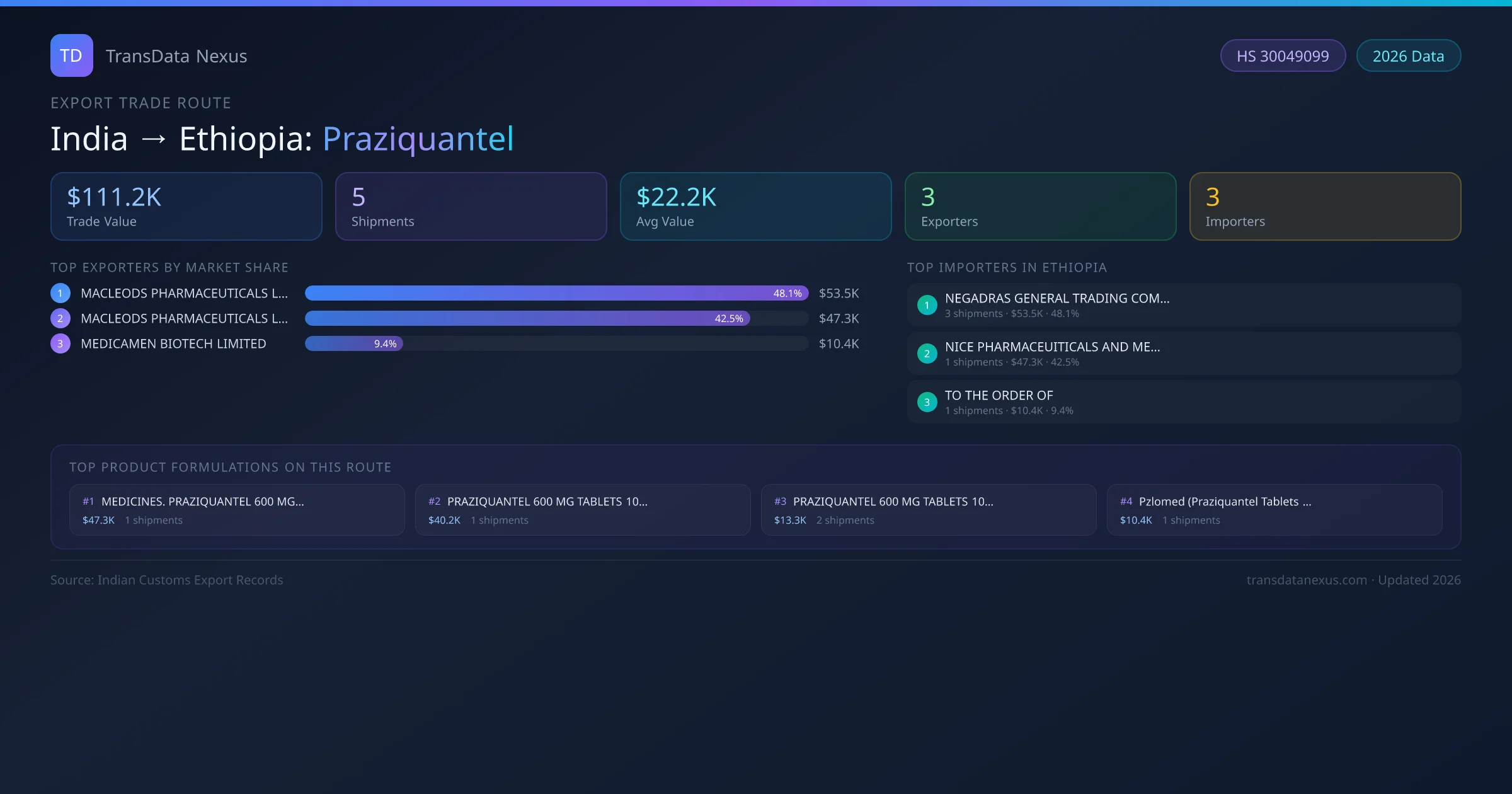 India has recorded 5 verified shipments of Praziquantel exported to Ethiopia, representing a combined trade value of $111.2K USD. This corridor is served by 3 active Indian exporters, with an average shipment value of $22.2K USD. The leading Indian exporter is MACLEODS PHARMACEUTICALS LIMITED, which accounts for 48% of total export value with 3 shipments worth $53.5K USD. On the buying side, NEGADRAS GENERAL TRADING COMPANY PL is the largest importer in Ethiopia with $53.5K USD in purchases. The top 3 suppliers — MACLEODS PHARMACEUTICALS LIMITED, MACLEODS PHARMACEUTICALS LTD , MEDICAMEN BIOTECH LIMITED — together control 100% of total trade value on this route. All data sourced from Indian Customs (DGFT) shipping bill records. Values reported in FOB USD.