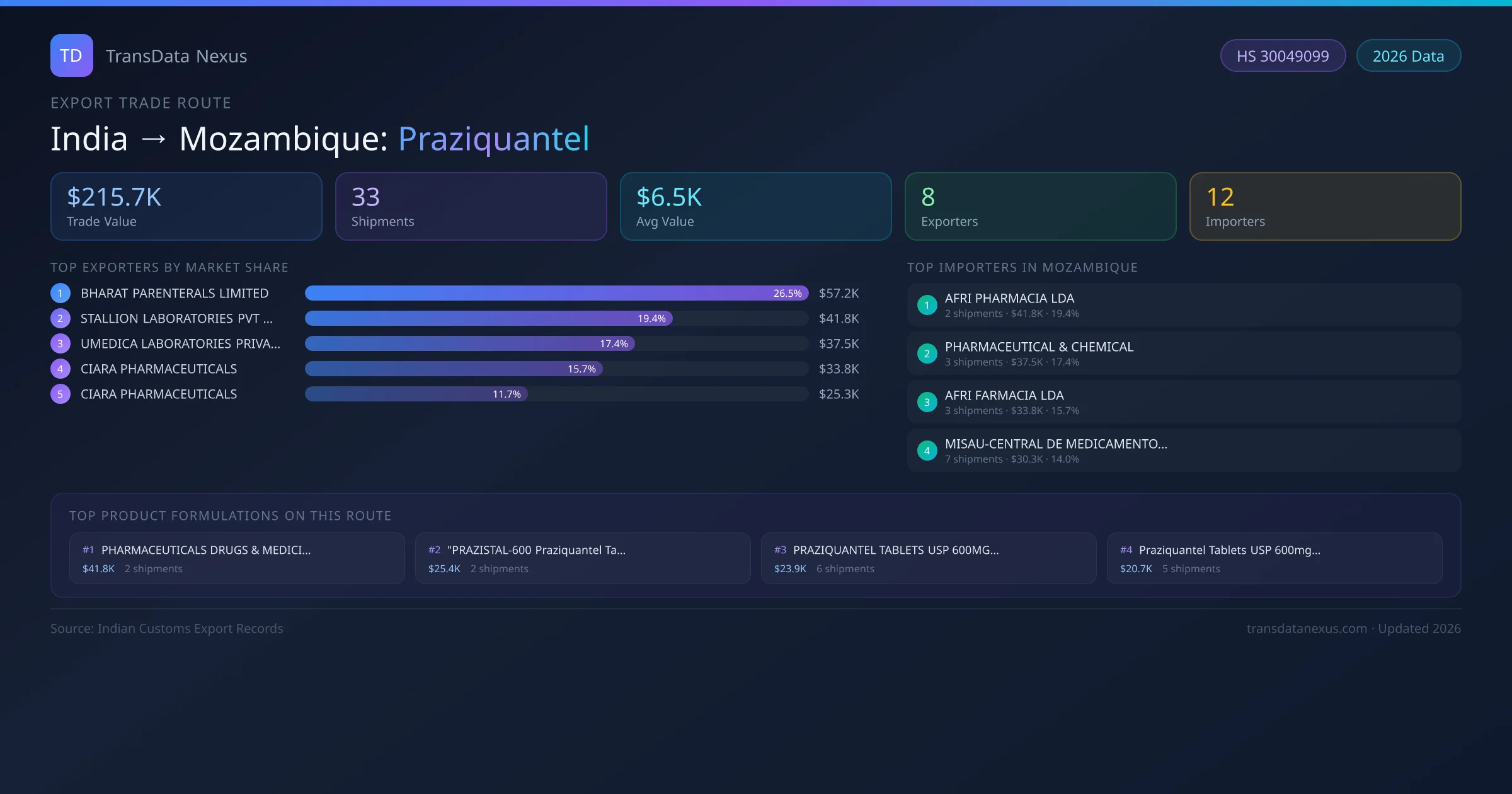 - 1.Route Identification: India to Mozambique export trade corridor identified from Indian Customs (DGFT) records for Praziquantel.