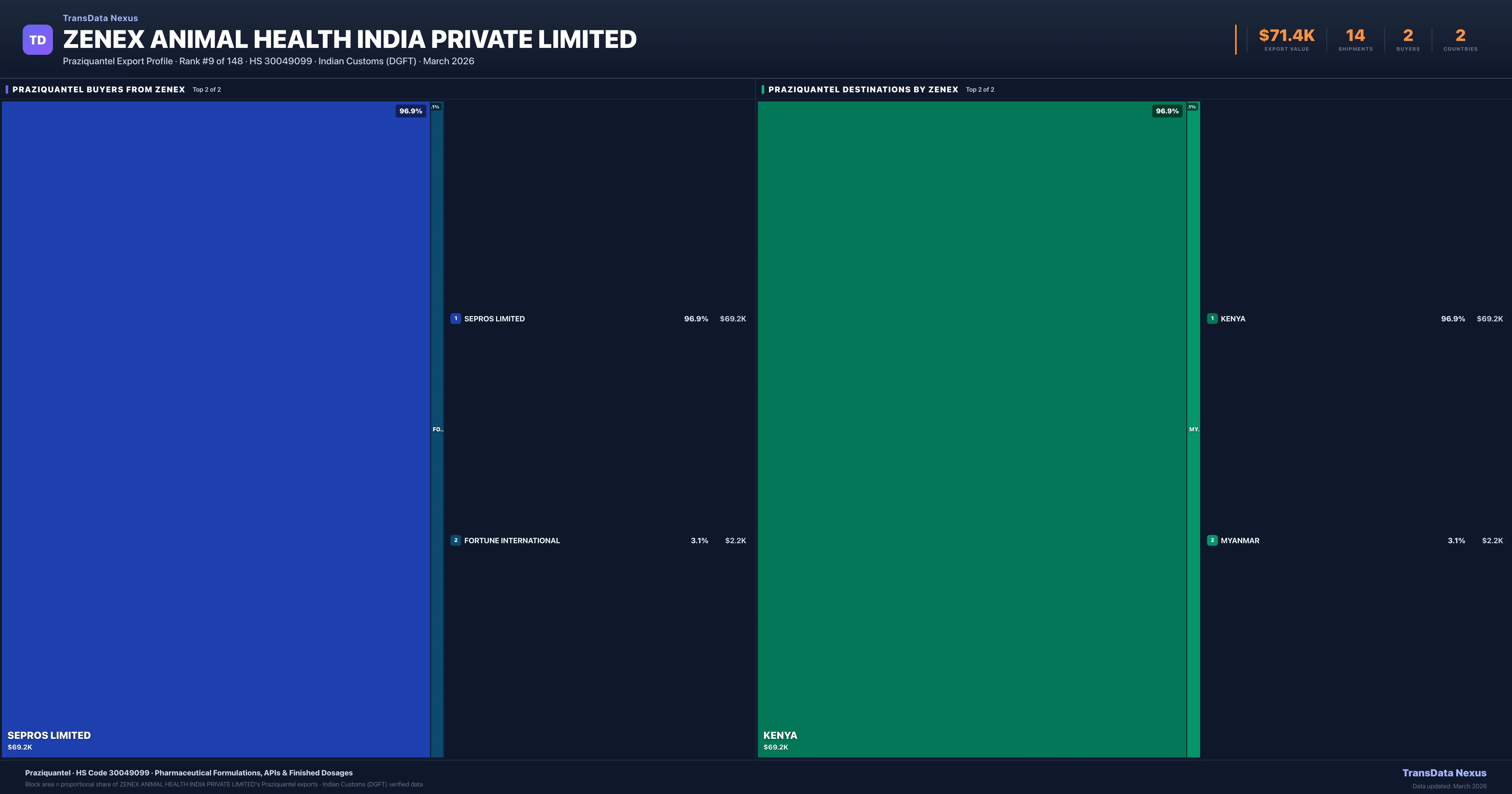 - 4.Verified Records: This page is backed by 14 individual customs records matching Zenex Animal Health India Private Limited exporting Praziquantel, covering 12 formulations to 2 countries via 2 buyers.