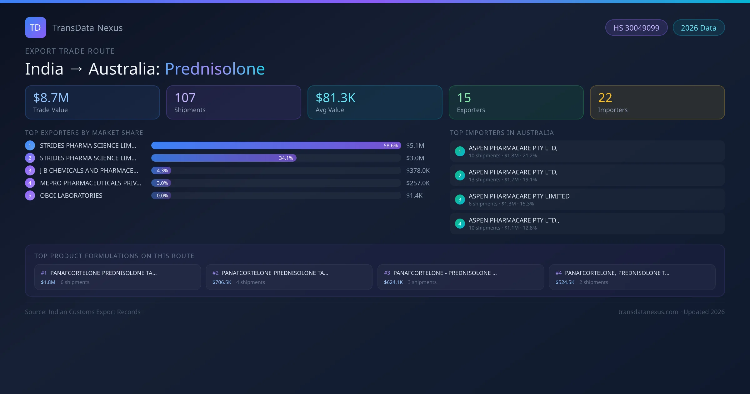 The India to Australia Prednisolone corridor is one of India's established pharmaceutical export routes, with 107 shipments documented worth a combined $8.7M USD. The route is dominated by STRIDES PHARMA SCIENCE LIMITED, which alone accounts for roughly 59% of all export value, reflecting the consolidated nature of India's prednisolone manufacturing sector.