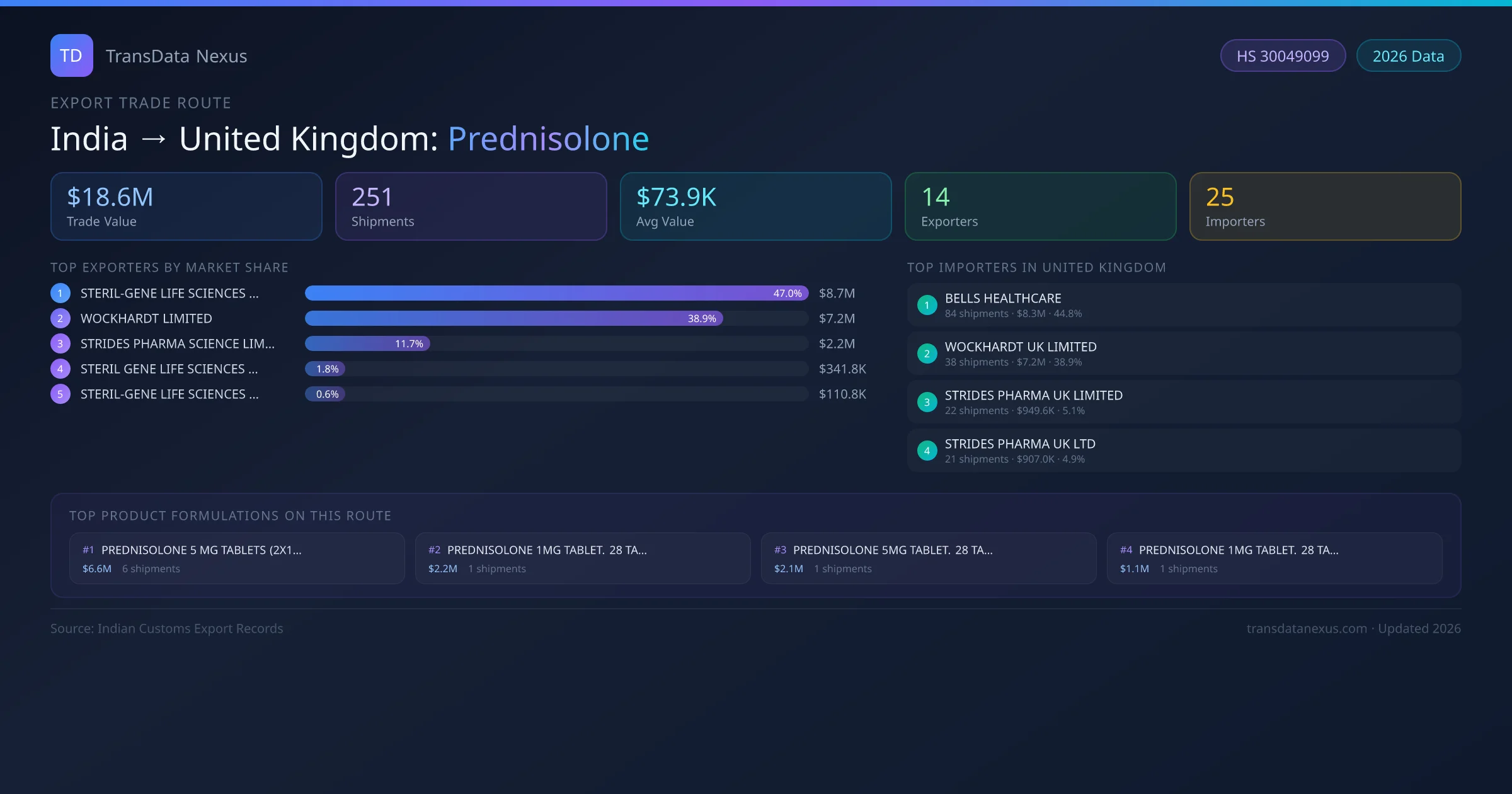 India has recorded 251 verified shipments of Prednisolone exported to United Kingdom, representing a combined trade value of $18.6M USD. This corridor is served by 14 active Indian exporters, with an average shipment value of $73.9K USD. The leading Indian exporter is STERIL-GENE LIFE SCIENCES PRIVATE LIMITED, which accounts for 47% of total export value with 103 shipments worth $8.7M USD. On the buying side, BELLS HEALTHCARE is the largest importer in United Kingdom with $8.3M USD in purchases. The top 3 suppliers — STERIL-GENE LIFE SCIENCES PRIVATE LIMITED, WOCKHARDT LIMITED, STRIDES PHARMA SCIENCE LIMITED — together control 98% of total trade value on this route. All data sourced from Indian Customs (DGFT) shipping bill records. Values reported in FOB USD.