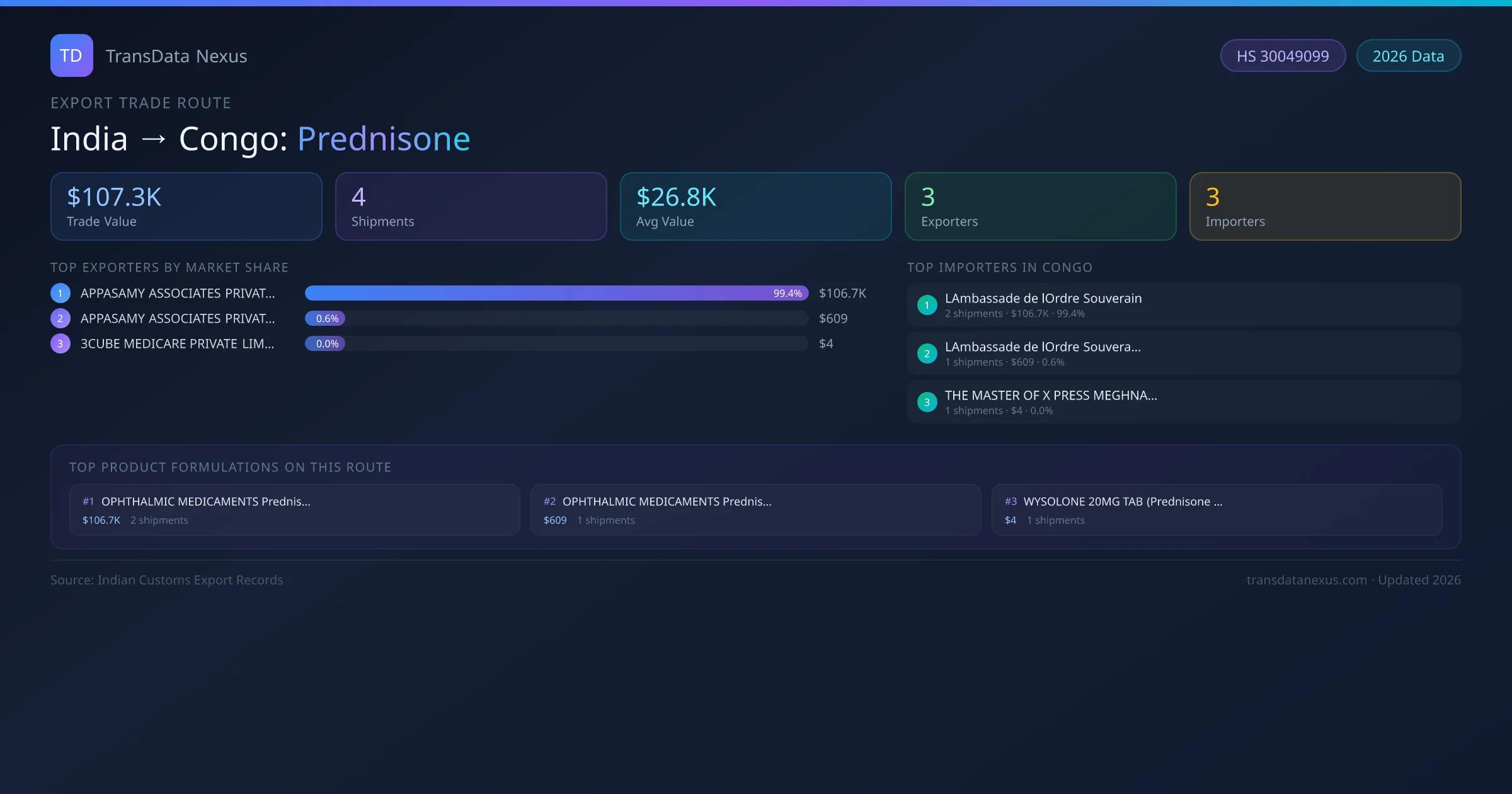 India has recorded 4 verified shipments of Prednisone exported to Congo, representing a combined trade value of $107.3K USD. This corridor is served by 3 active Indian exporters, with an average shipment value of $26.8K USD. The leading Indian exporter is APPASAMY ASSOCIATES PRIVATE LIMITED, which accounts for 99% of total export value with 2 shipments worth $106.7K USD. On the buying side, LAmbassade de lOrdre Souverain is the largest importer in Congo with $106.7K USD in purchases. The top 3 suppliers — APPASAMY ASSOCIATES PRIVATE LIMITED, APPASAMY ASSOCIATES PRIVATE LIMITED , 3CUBE MEDICARE PRIVATE LIMITED — together control 100% of total trade value on this route. All data sourced from Indian Customs (DGFT) shipping bill records. Values reported in FOB USD.