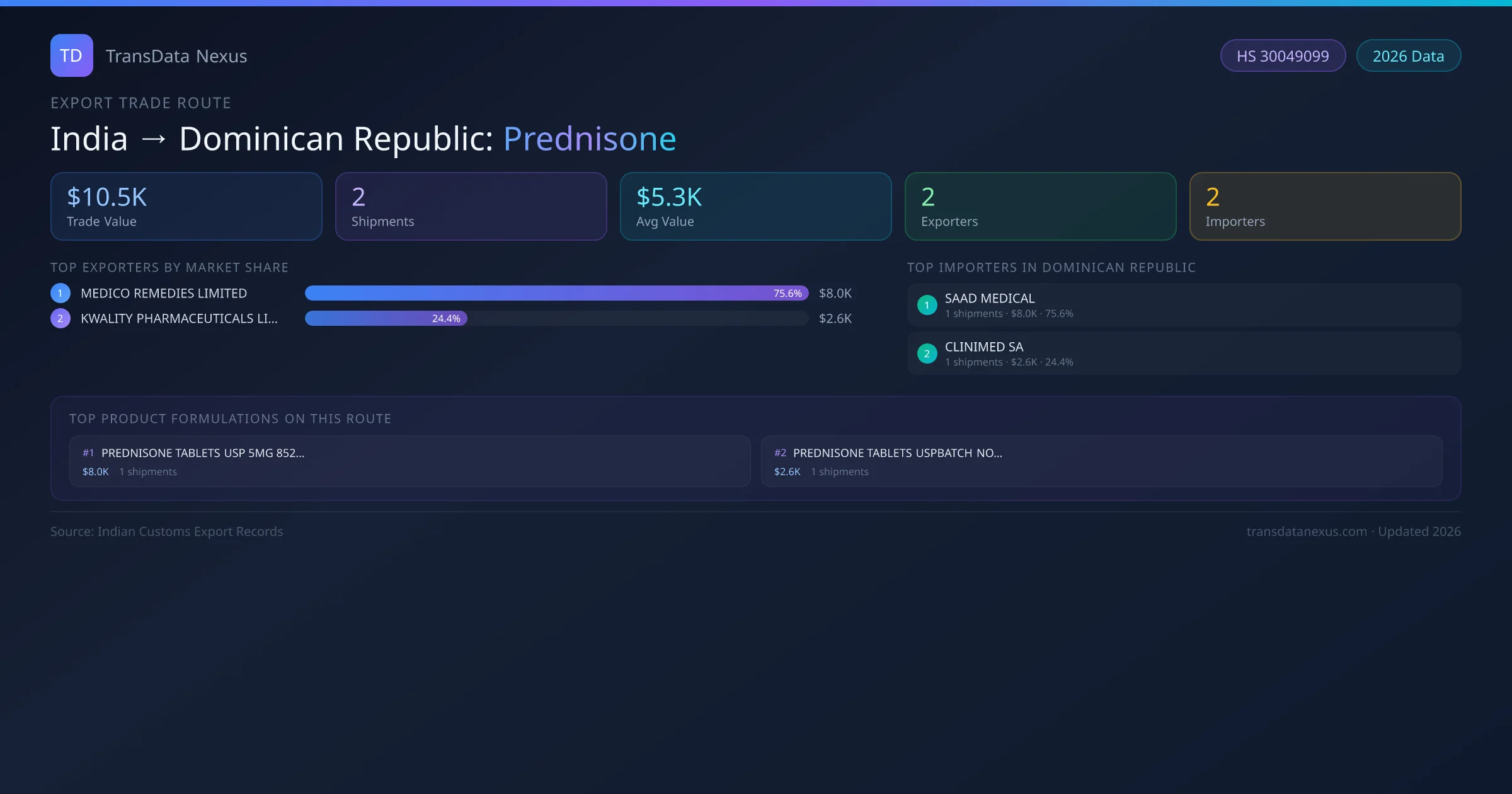 - 1.Route Identification: India to Dominican Republic export trade corridor identified from Indian Customs (DGFT) records for Prednisone.