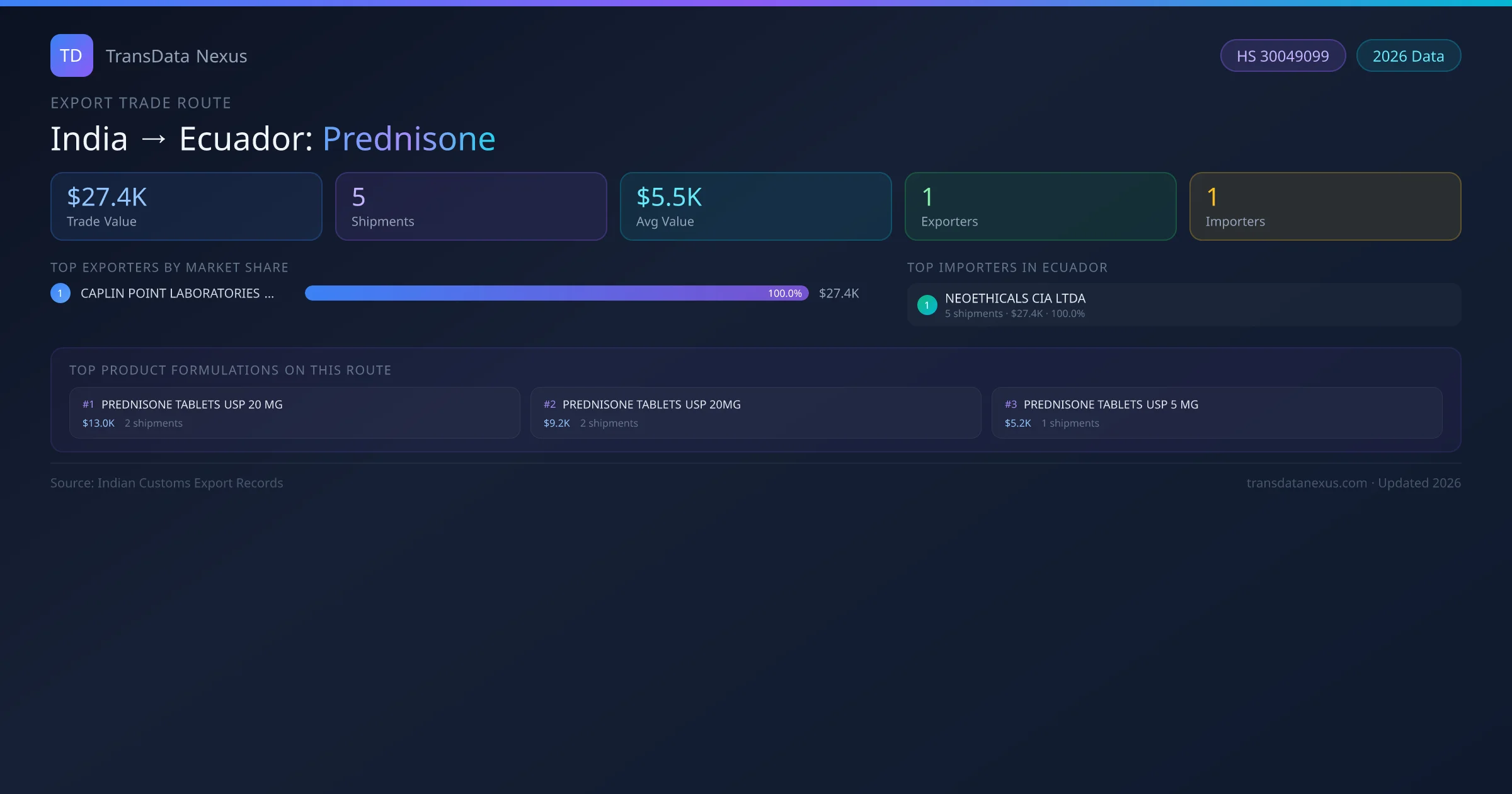- 1.Route Identification: India to Ecuador export trade corridor identified from Indian Customs (DGFT) records for Prednisone.