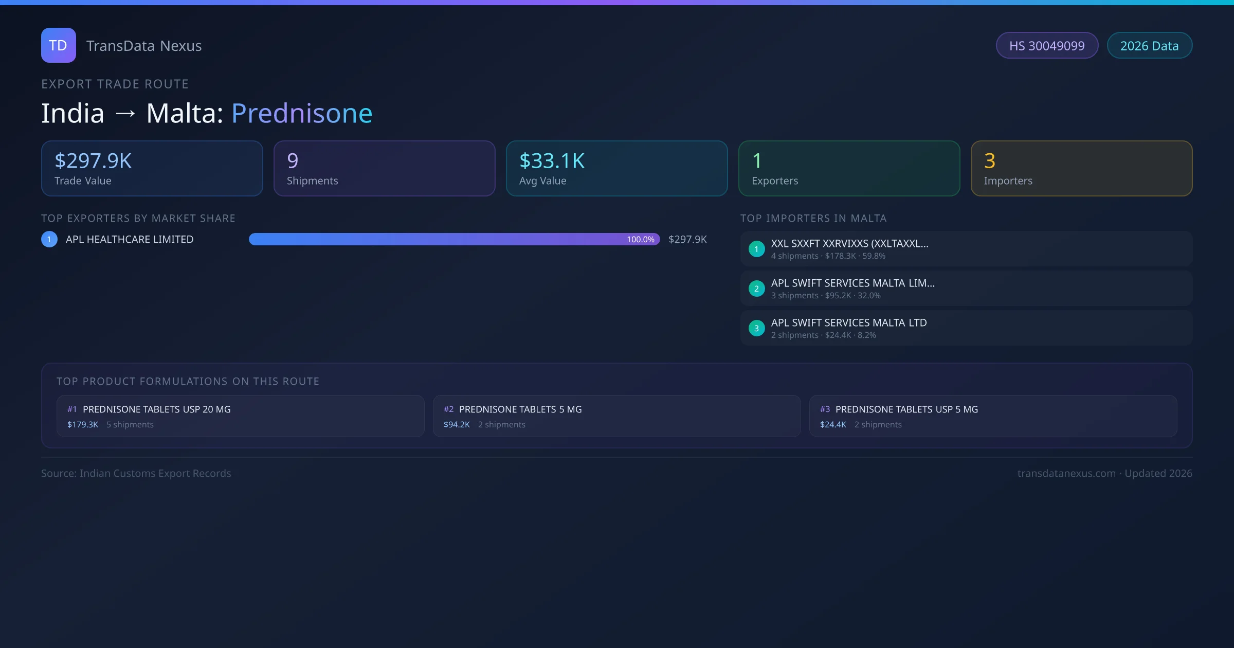 The India to Malta Prednisone corridor is one of India's established pharmaceutical export routes, with 9 shipments documented worth a combined $297.9K USD. The route is dominated by APL HEALTHCARE LIMITED, which alone accounts for roughly 100% of all export value, reflecting the consolidated nature of India's prednisone manufacturing sector.