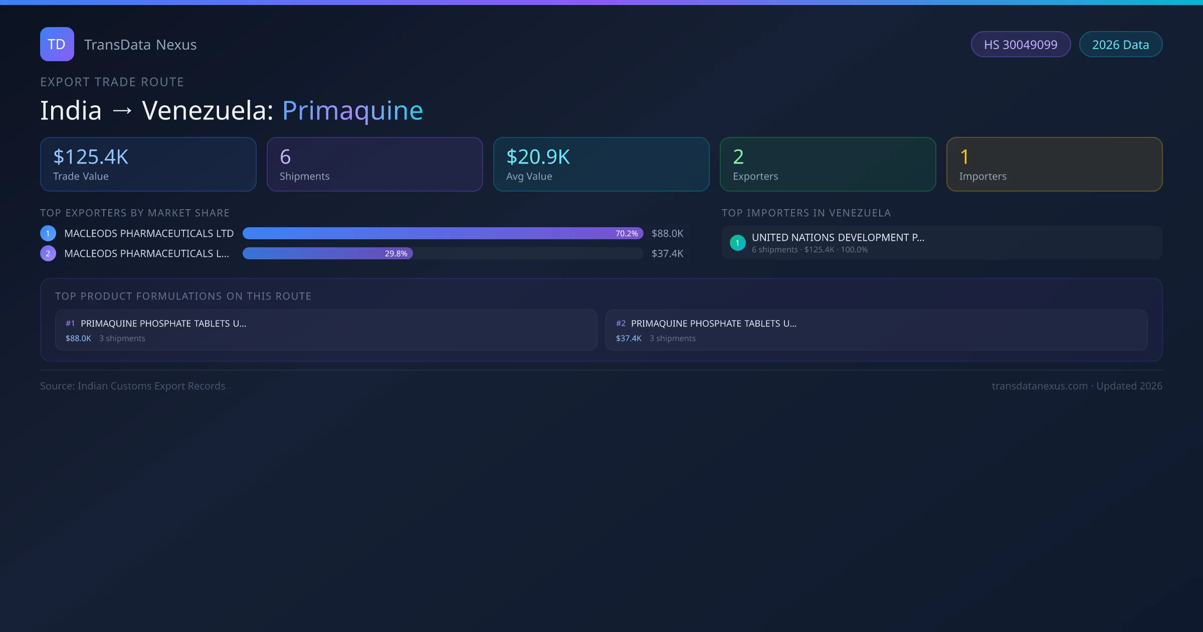 The India to Venezuela Primaquine corridor is one of India's established pharmaceutical export routes, with 6 shipments documented worth a combined $125.4K USD. The route is dominated by MACLEODS PHARMACEUTICALS LTD, which alone accounts for roughly 70% of all export value, reflecting the consolidated nature of India's primaquine manufacturing sector.