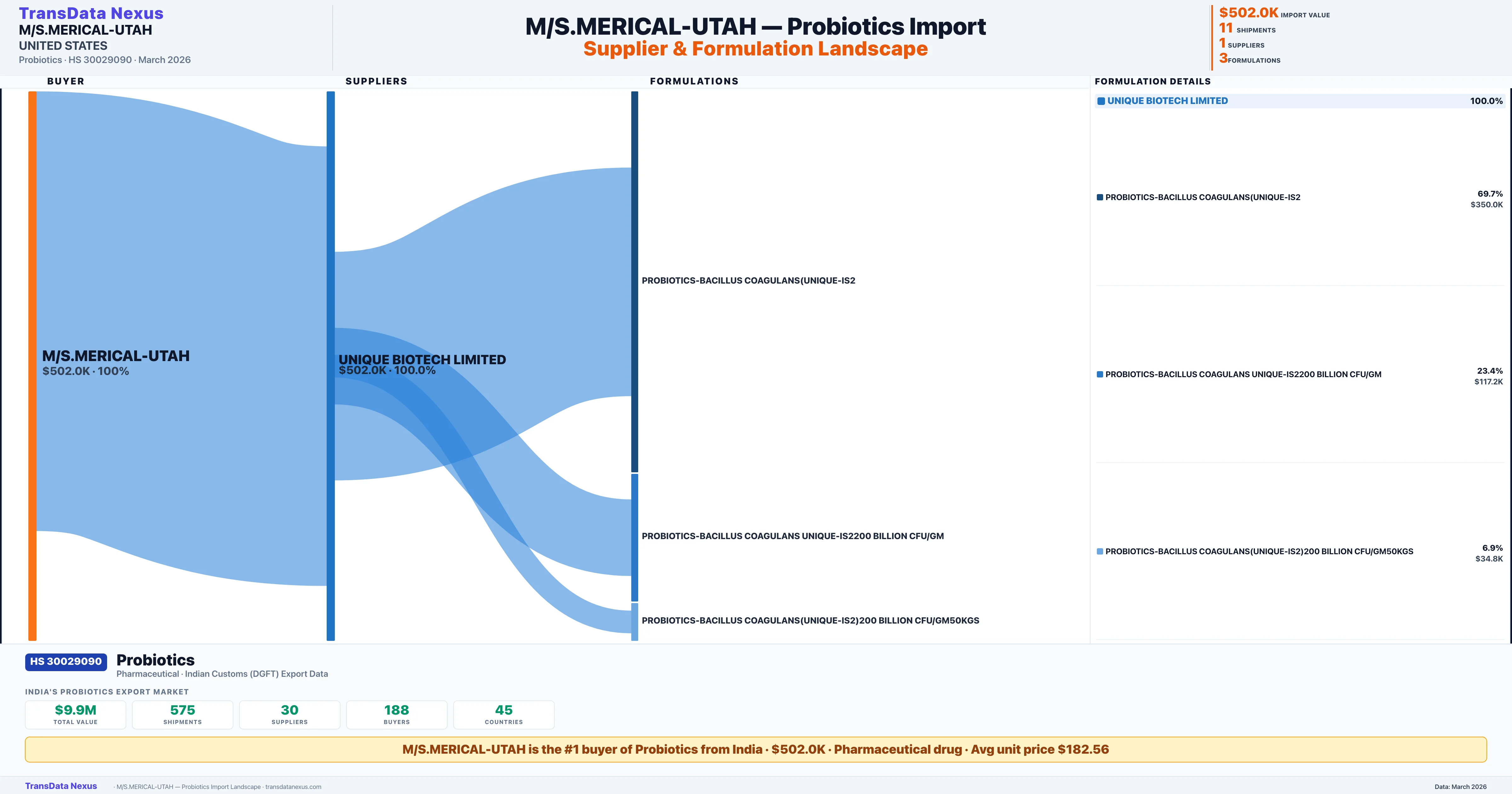 M/S.MERICAL-UTAH sources Probiotics from 1 verified Indian supplier: UNIQUE BIOTECH LIMITED ($502.0K, 100.0%). This is based on 11 customs records.
