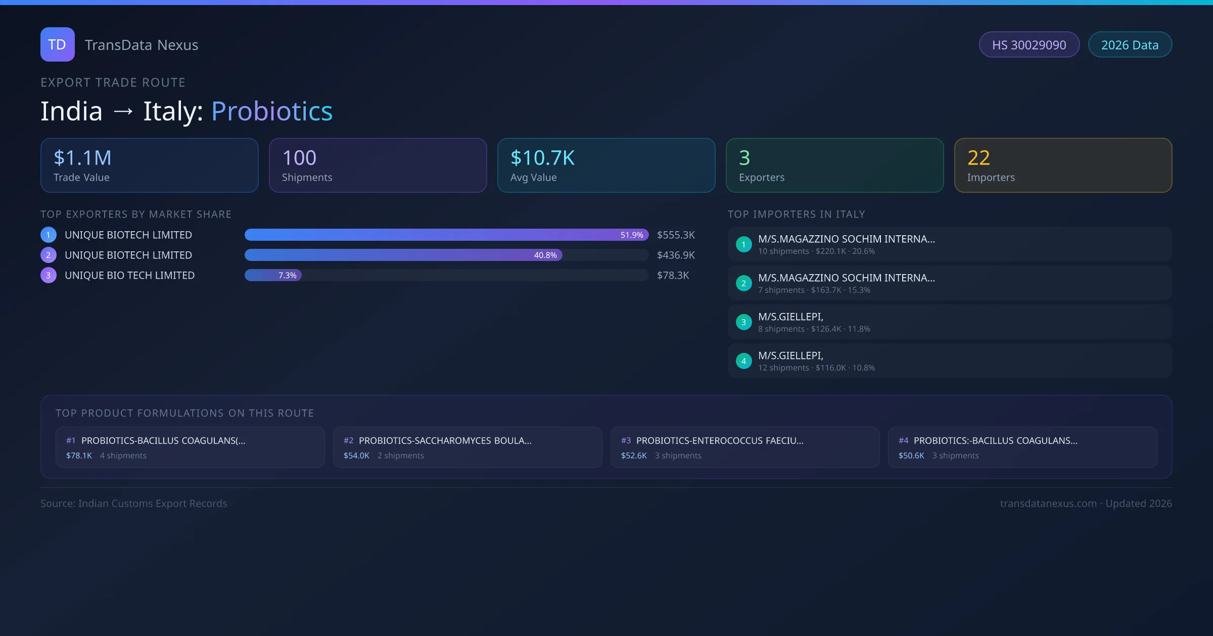 India has recorded 100 verified shipments of Probiotics exported to Italy, representing a combined trade value of $1.1M USD. This corridor is served by 3 active Indian exporters, with an average shipment value of $10.7K USD. The leading Indian exporter is UNIQUE BIOTECH LIMITED, which accounts for 52% of total export value with 58 shipments worth $555.3K USD. On the buying side, M/S.MAGAZZINO SOCHIM INTERNATIONAL is the largest importer in Italy with $220.1K USD in purchases. The top 3 suppliers — UNIQUE BIOTECH LIMITED, UNIQUE BIOTECH LIMITED , UNIQUE BIO TECH LIMITED — together control 100% of total trade value on this route. All data sourced from Indian Customs (DGFT) shipping bill records. Values reported in FOB USD.