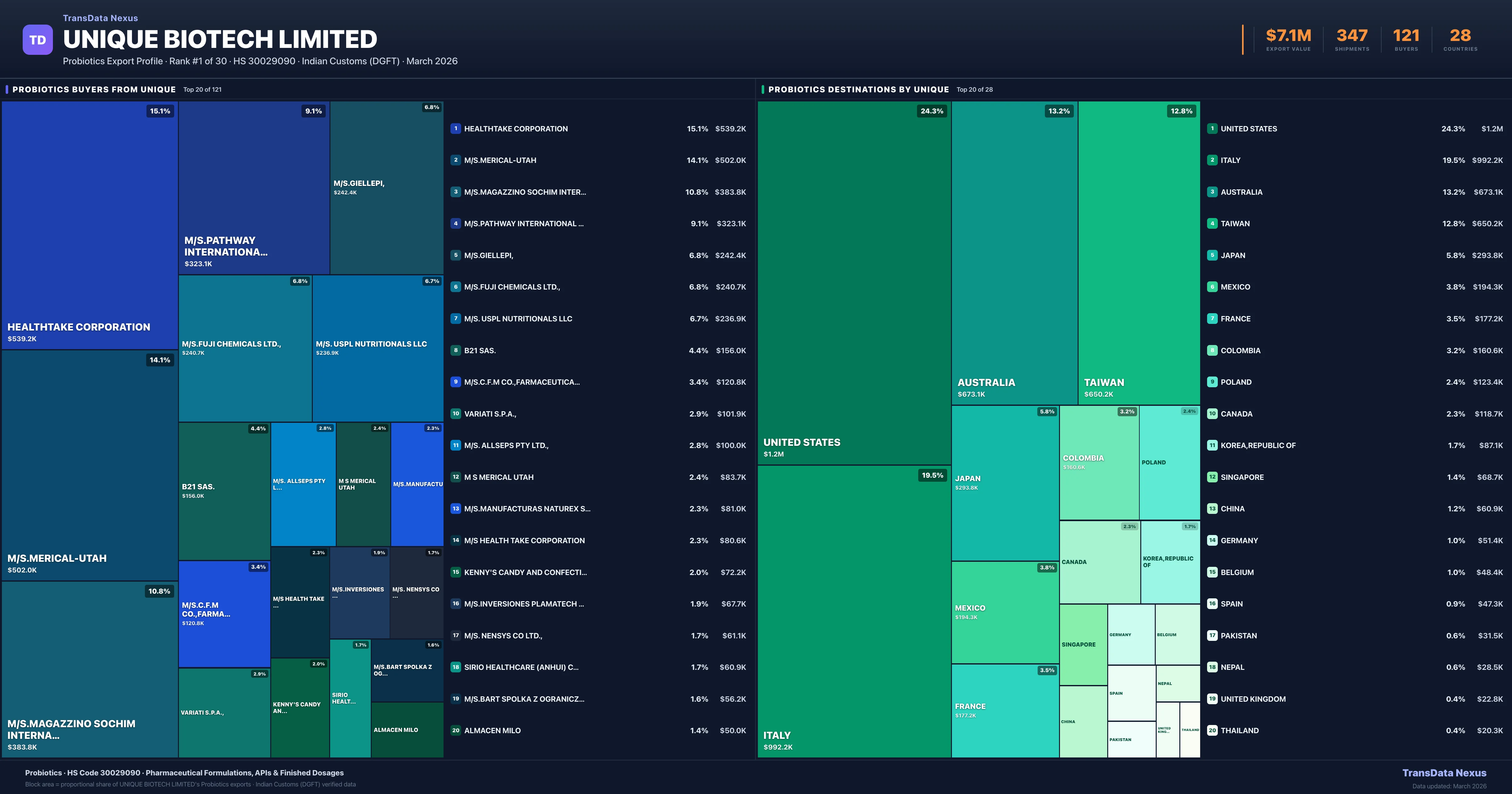 Unique Biotech Limited is the #1 Indian exporter of Probiotics with $7.1M in export value and 347 verified shipments. Unique Biotech Limited holds a 71.2% market share in Probiotics exports across 26 countries.
