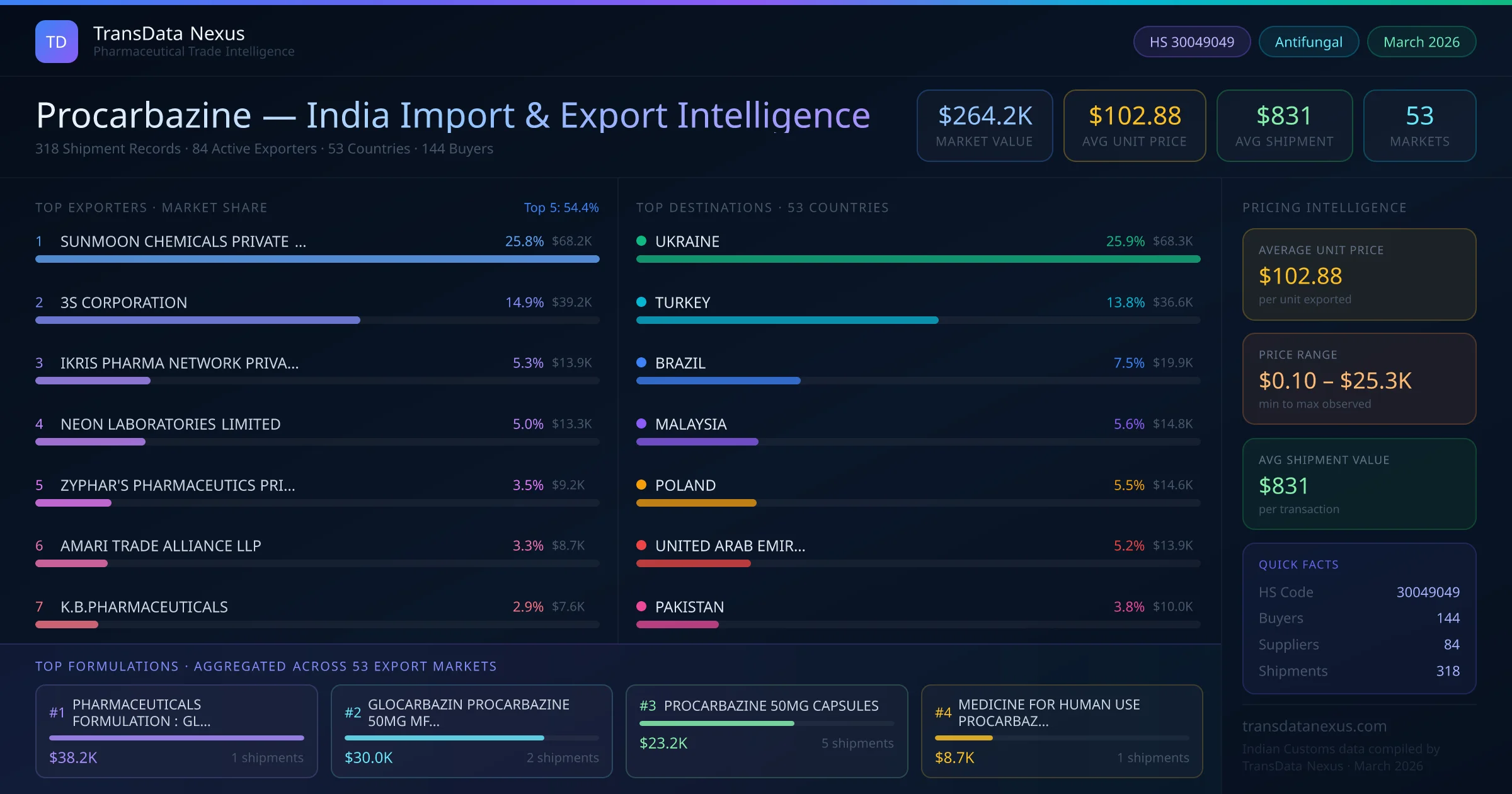 The total export value of procarbazine from India is $264.2K, recorded across 318 shipments from 84 active exporters to 53 countries. The average shipment value is $831.