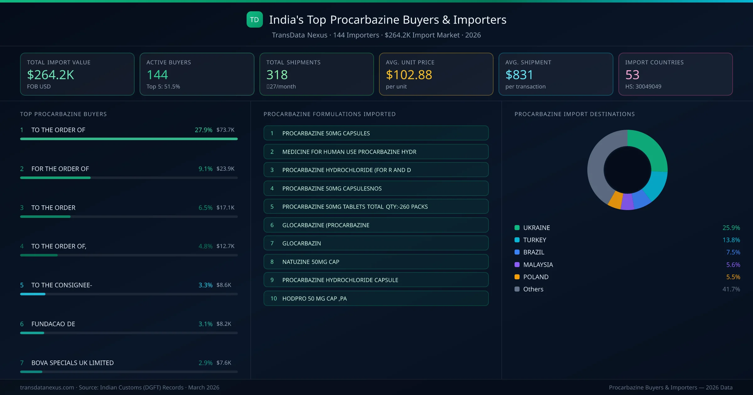 Procarbazine buyer data โ 144 importers ยท $264.2K market ยท 318 shipmentsTransData Nexus ยท Indian Customs Data
