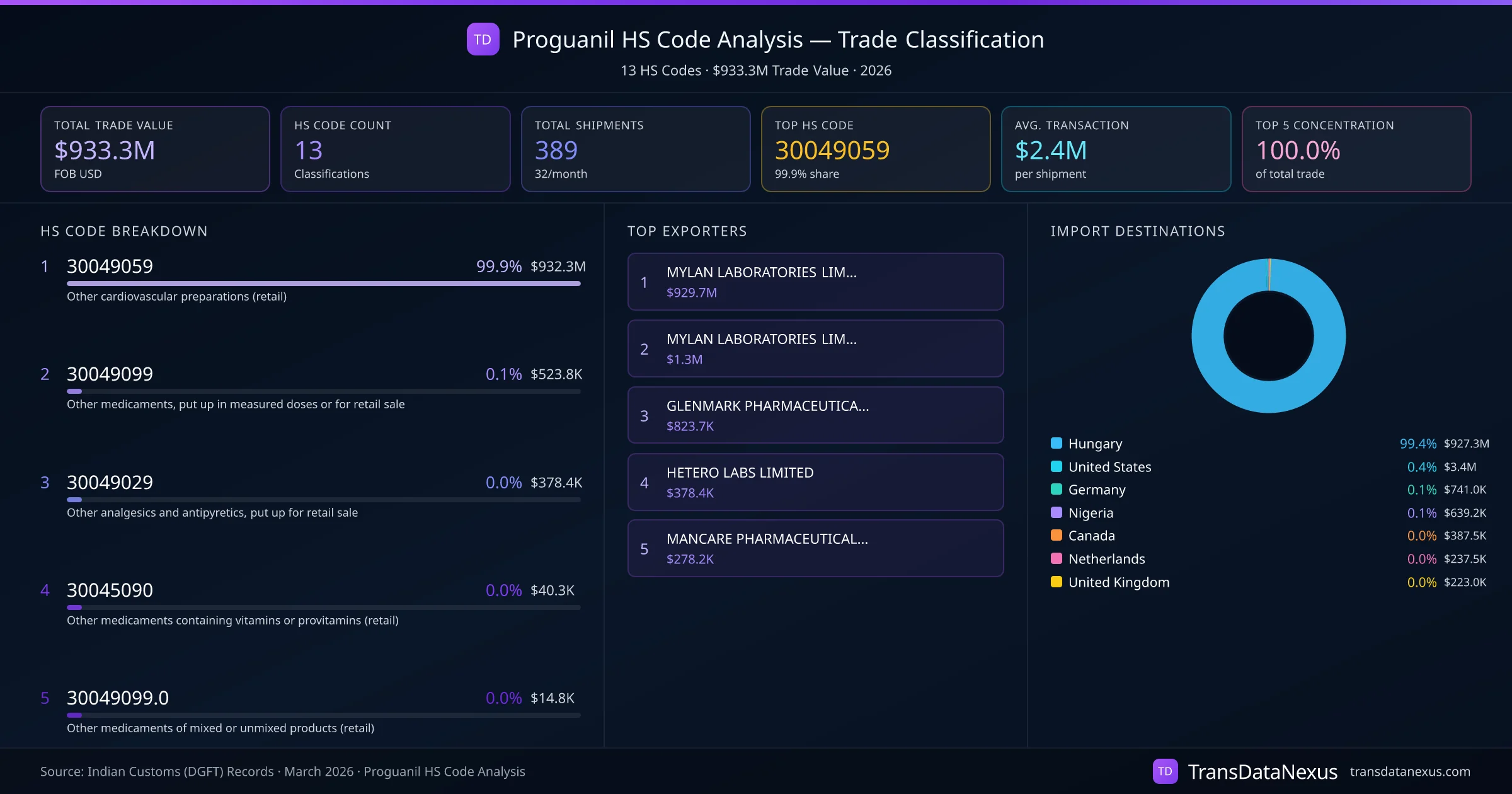 India exports Proguanil under 13 distinct HS code classifications, representing a total trade value of $933.3M across 389 shipments. The dominant classification is HS 30049059 (Other cardiovascular preparations (retail)), accounting for 99.9% of all Proguanil trade at $932.3M. HS 30049099 (Other medicaments, put up in measured doses or for retail sale) follows at 0.1% ($523.8K). The top 5 HS codes together account for 100.0% of total Proguanil trade from India. The average transaction value is $2399229. Key importing markets include Hungary, United States, Germany. Leading exporters include MYLAN LABORATORIES LIMITED and MYLAN LABORATORIES LIMITED . Data sourced from Indian Customs (DGFT) shipping bill records.