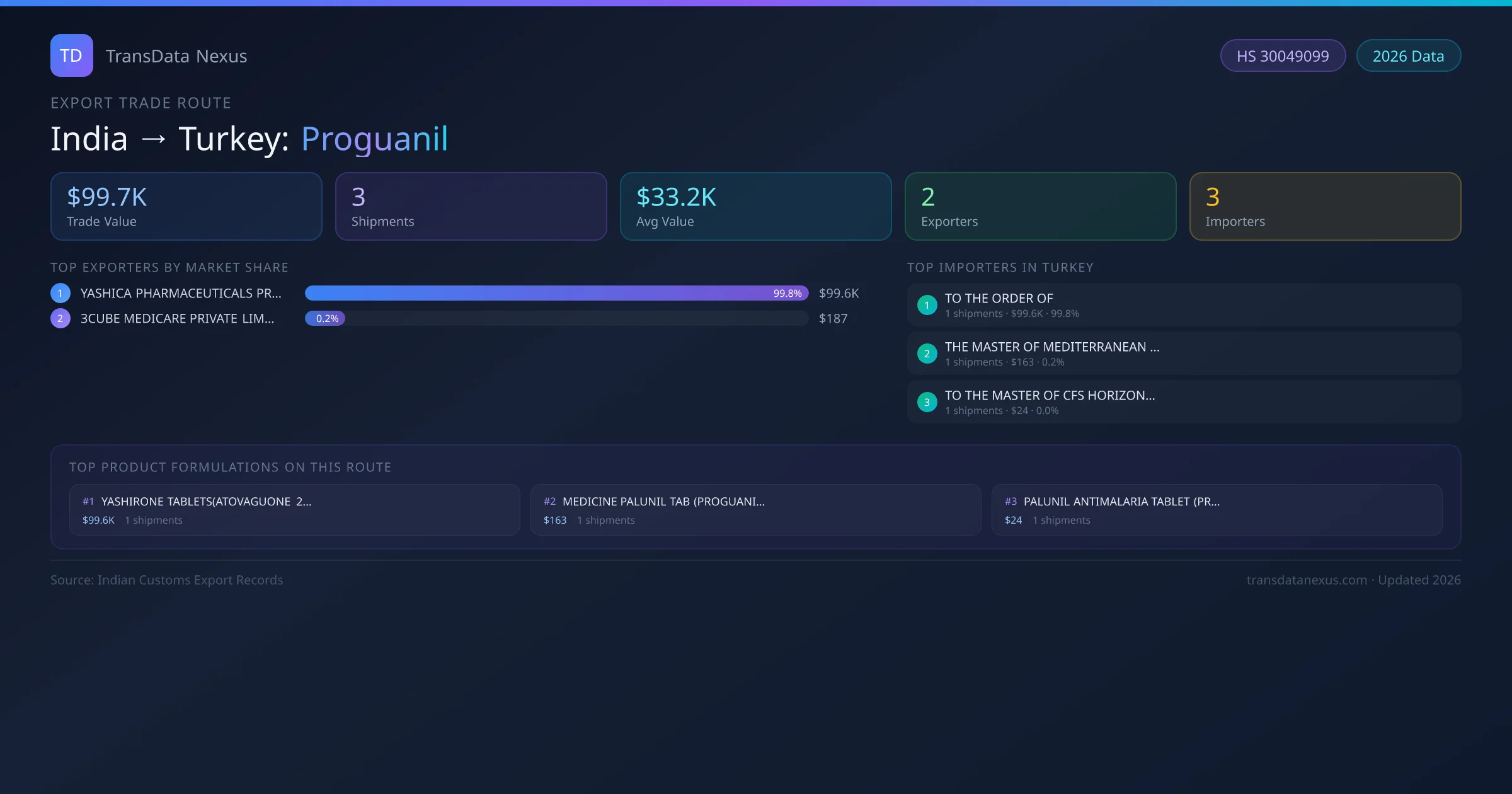 The India to Turkey Proguanil corridor is one of India's established pharmaceutical export routes, with 3 shipments documented worth a combined $99.7K USD. The route is dominated by YASHICA PHARMACEUTICALS PRIVATE LIMITED, which alone accounts for roughly 100% of all export value, reflecting the consolidated nature of India's proguanil manufacturing sector.