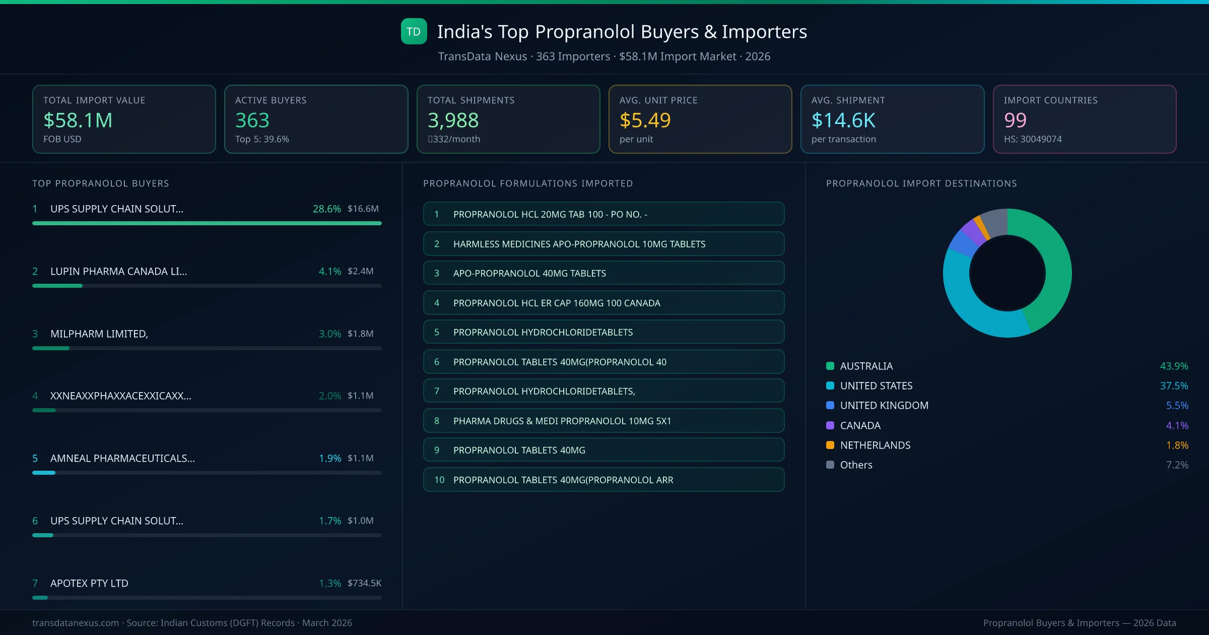 Propranolol buyer data โ 363 importers ยท $58.1M market ยท 3,988 shipmentsTransData Nexus ยท Indian Customs Data