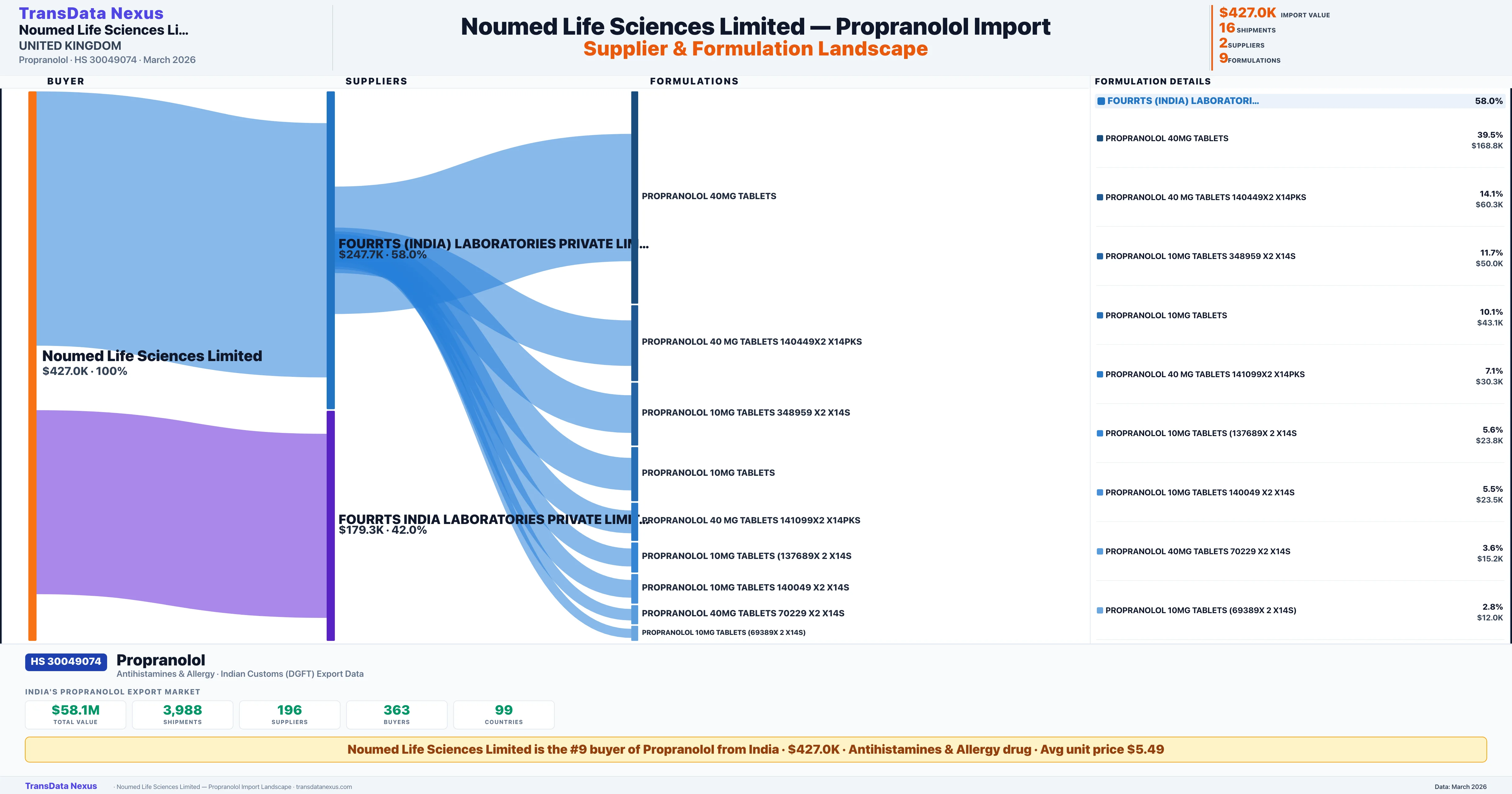 NOUMED LIFE SCIENCES LIMITED sources Propranolol from 2 verified Indian suppliers: FOURRTS (INDIA) LABORATORIES PRIVATE LIMITED ($247.7K, 58.0%), FOURRTS INDIA LABORATORIES PRIVATE LIMITED ($179.3K, 42.0%). This is based on 16 customs records.
