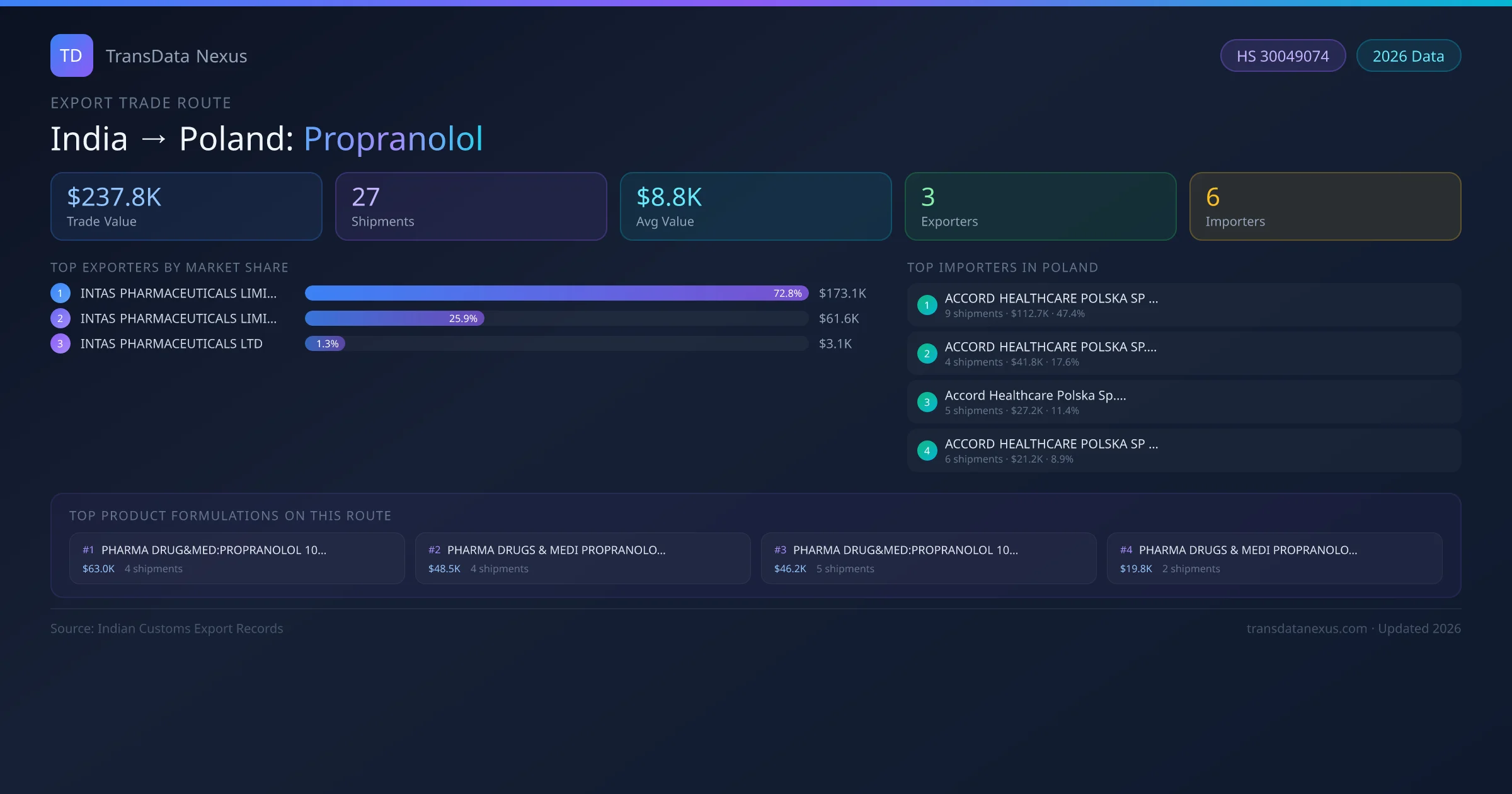 India has recorded 27 verified shipments of Propranolol exported to Poland, representing a combined trade value of $237.8K USD. This corridor is served by 3 active Indian exporters, with an average shipment value of $8.8K USD. The leading Indian exporter is INTAS PHARMACEUTICALS LIMITED, which accounts for 73% of total export value with 19 shipments worth $173.1K USD. On the buying side, ACCORD HEALTHCARE POLSKA SP Z O O is the largest importer in Poland with $112.7K USD in purchases. The top 3 suppliers — INTAS PHARMACEUTICALS LIMITED, INTAS PHARMACEUTICALS LIMITED , INTAS PHARMACEUTICALS LTD — together control 100% of total trade value on this route. All data sourced from Indian Customs (DGFT) shipping bill records. Values reported in FOB USD.