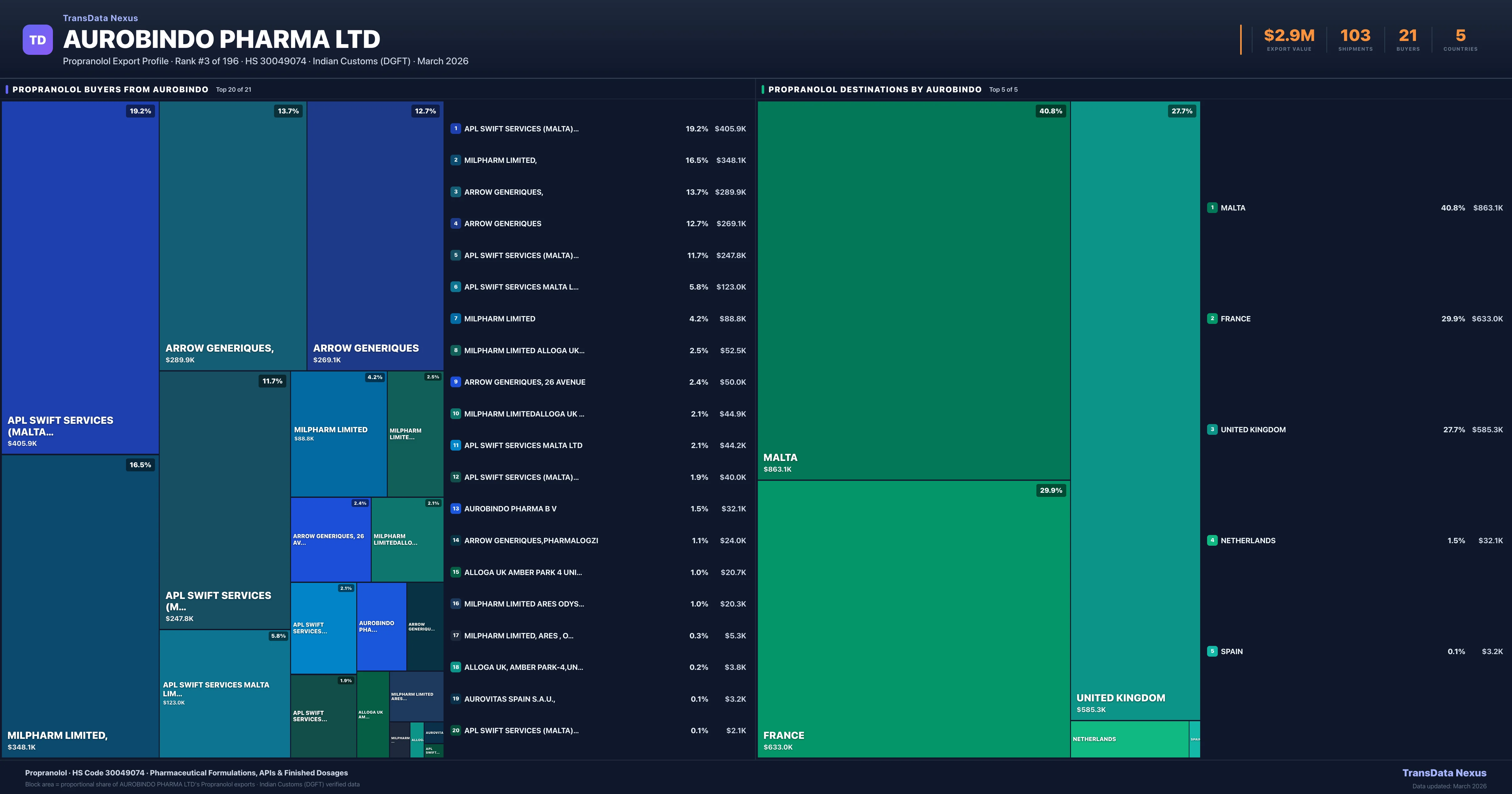 Aurobindo Pharma Ltd's average Propranolol shipment value is $27.8K per consignment, based on 103 shipments totaling $2.9M. The largest destination is MALTA (40.8% of Aurobindo Pharma Ltd's Propranolol exports).