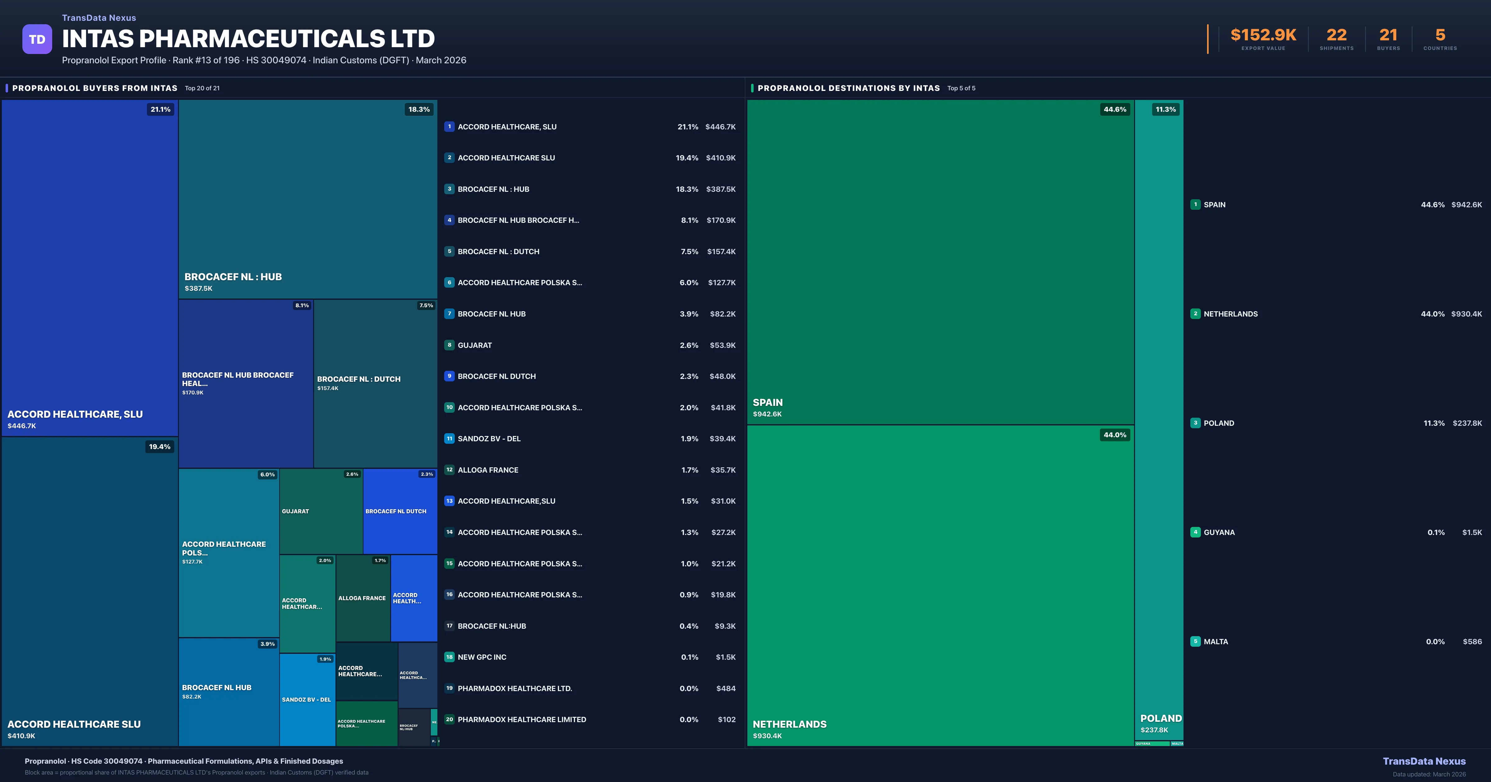 Intas Pharmaceuticals Ltd supplies Propranolol to 21 buyers globally. The largest buyer is ACCORD HEALTHCARE, SLU (SPAIN), followed by ACCORD HEALTHCARE SLU (SPAIN) and BROCACEF NL : HUB (NETHERLANDS). These buyers represent pharmaceutical distributors, hospital groups, and government procurement agencies in their respective markets.
