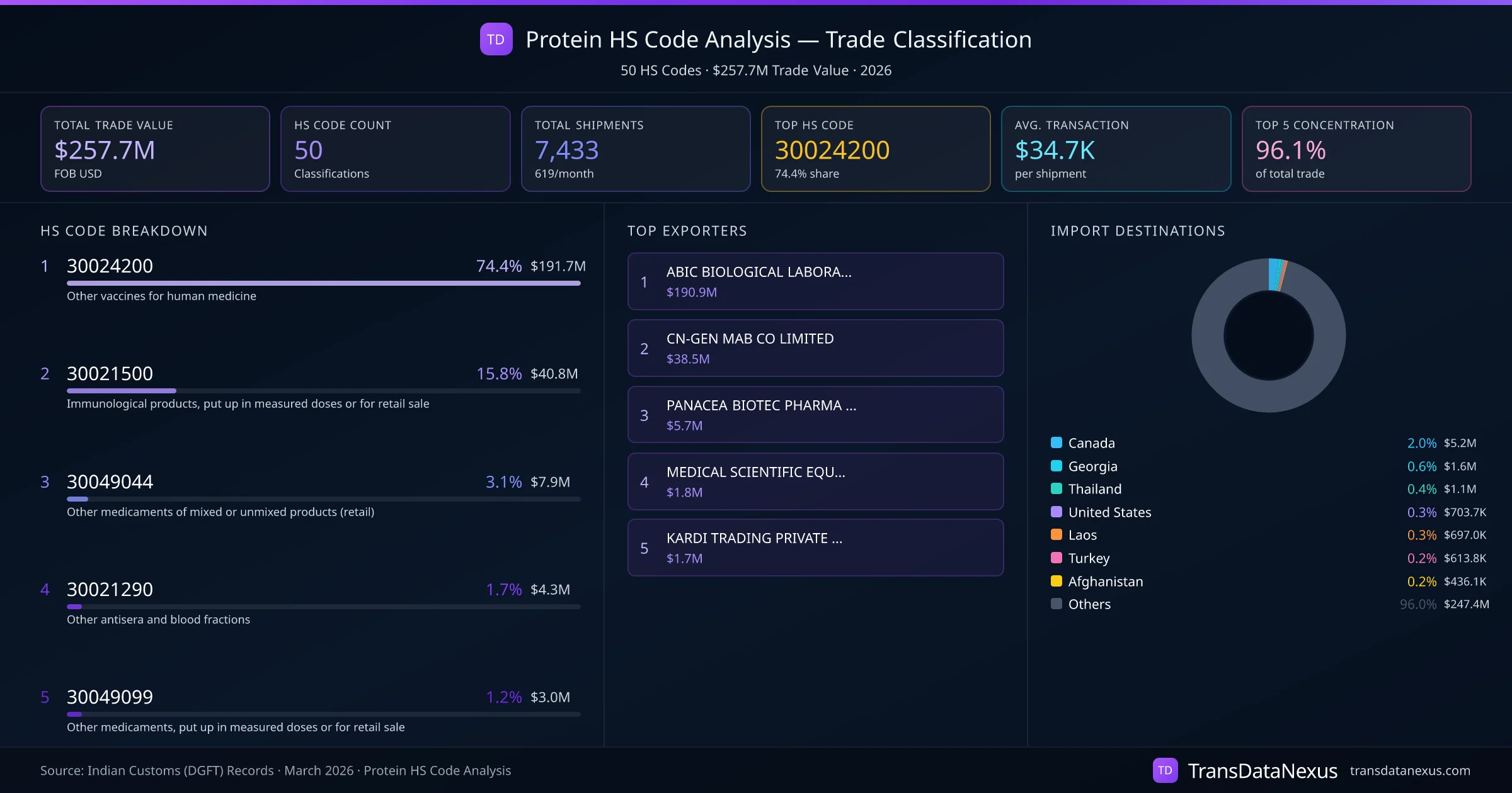 India exports Protein under 50 distinct HS code classifications, representing a total trade value of $257.7M across 7,433 shipments. The dominant classification is HS 30024200 (Other vaccines for human medicine), accounting for 74.4% of all Protein trade at $191.7M. HS 30021500 (Immunological products, put up in measured doses or for retail sale) follows at 15.8% ($40.8M). The top 5 HS codes together account for 96.1% of total Protein trade from India. The average transaction value is $34673. Key importing markets include Canada, Georgia, Thailand. Leading exporters include ABIC BIOLOGICAL LABORATORIES LTD and CN-GEN MAB CO LIMITED. Data sourced from Indian Customs (DGFT) shipping bill records.