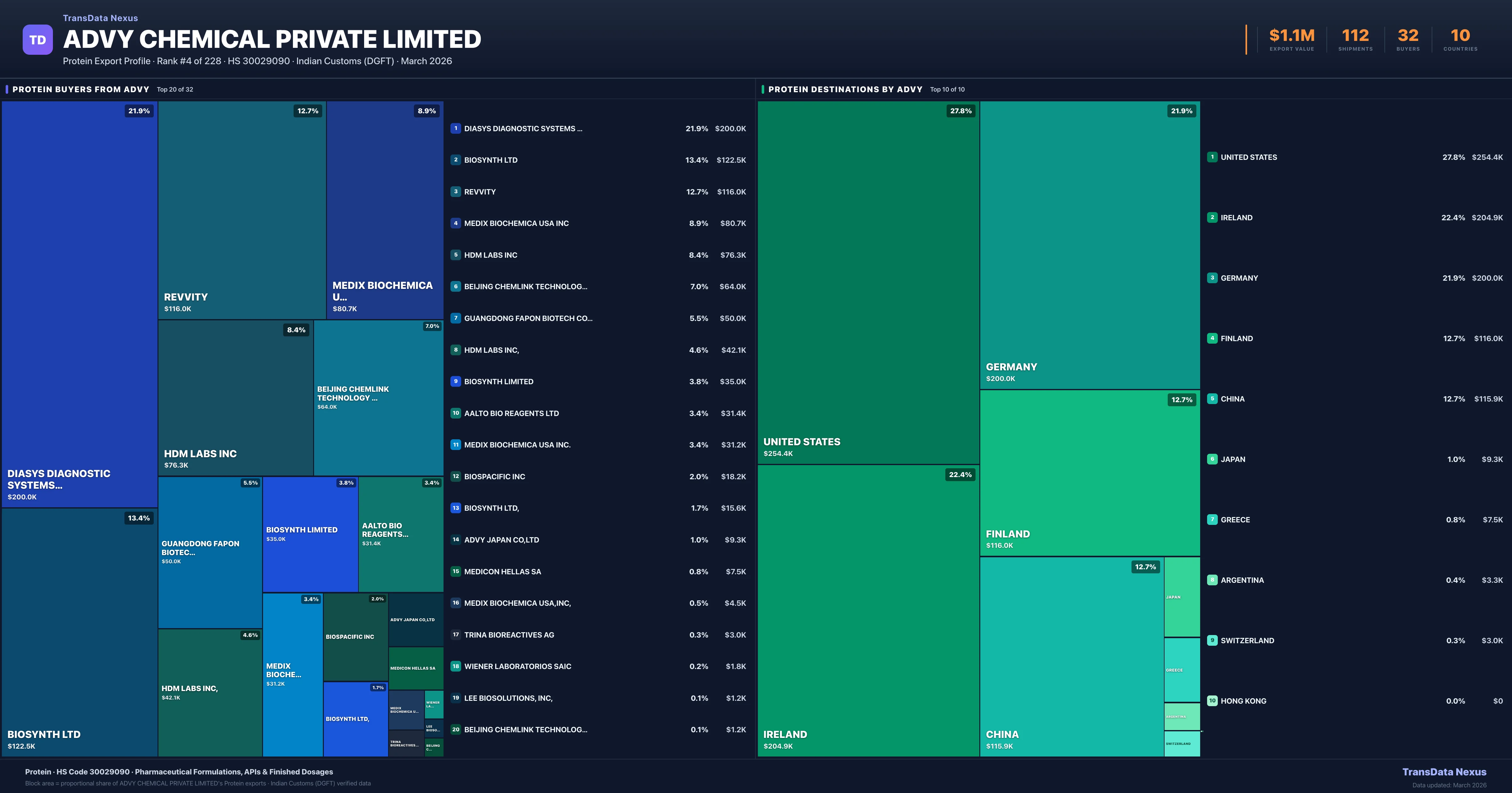 Advy Chemical Private Limited β Protein Export Profile: Buyers & Destinations
