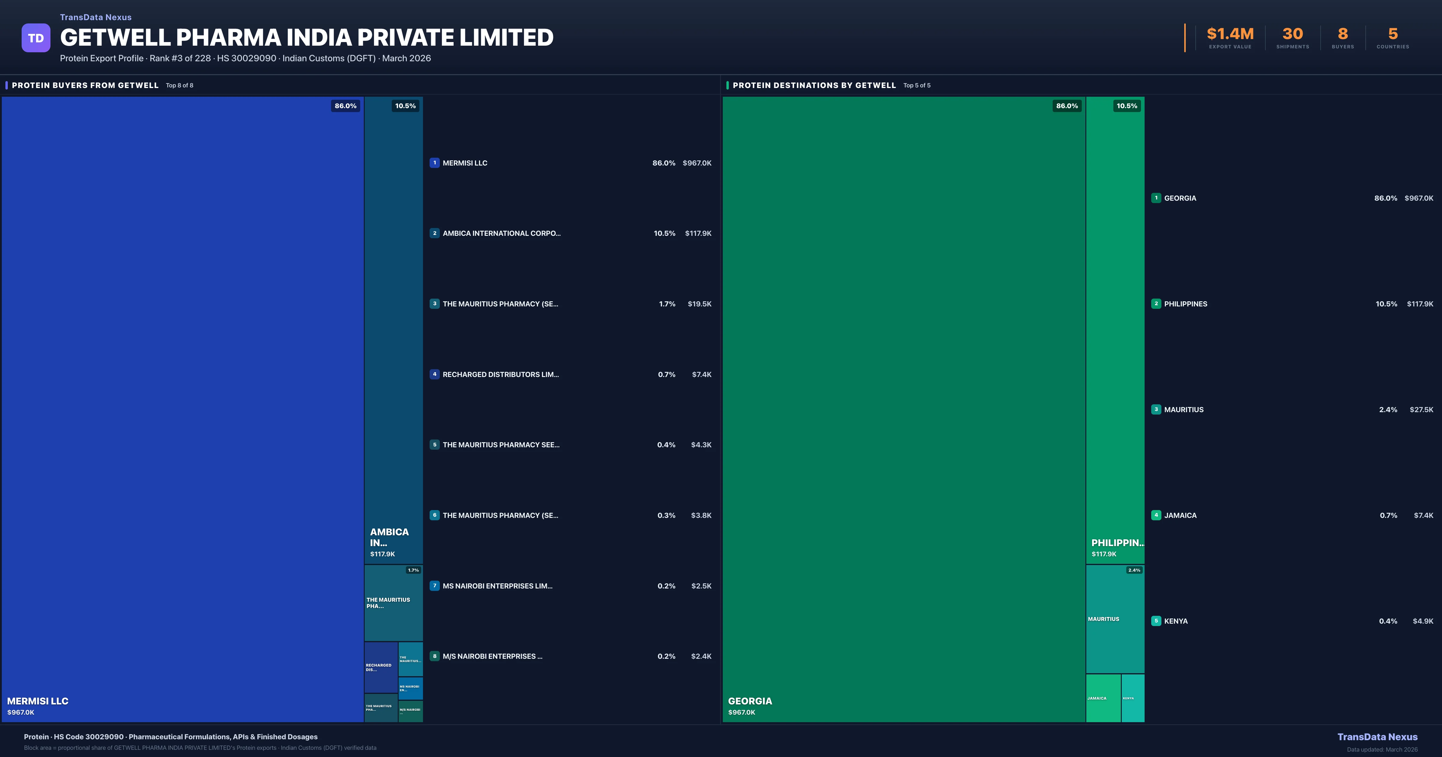 Getwell Pharma India Private Limited supplies Protein to 8 buyers globally. The largest buyer is MERMISI LLC (GEORGIA), followed by AMBICA INTERNATIONAL CORPORATION (PHILIPPINES) and THE MAURITIUS PHARMACY (SEEGOBIN) (MAURITIUS). These buyers represent pharmaceutical distributors, hospital groups, and government procurement agencies in their respective markets.