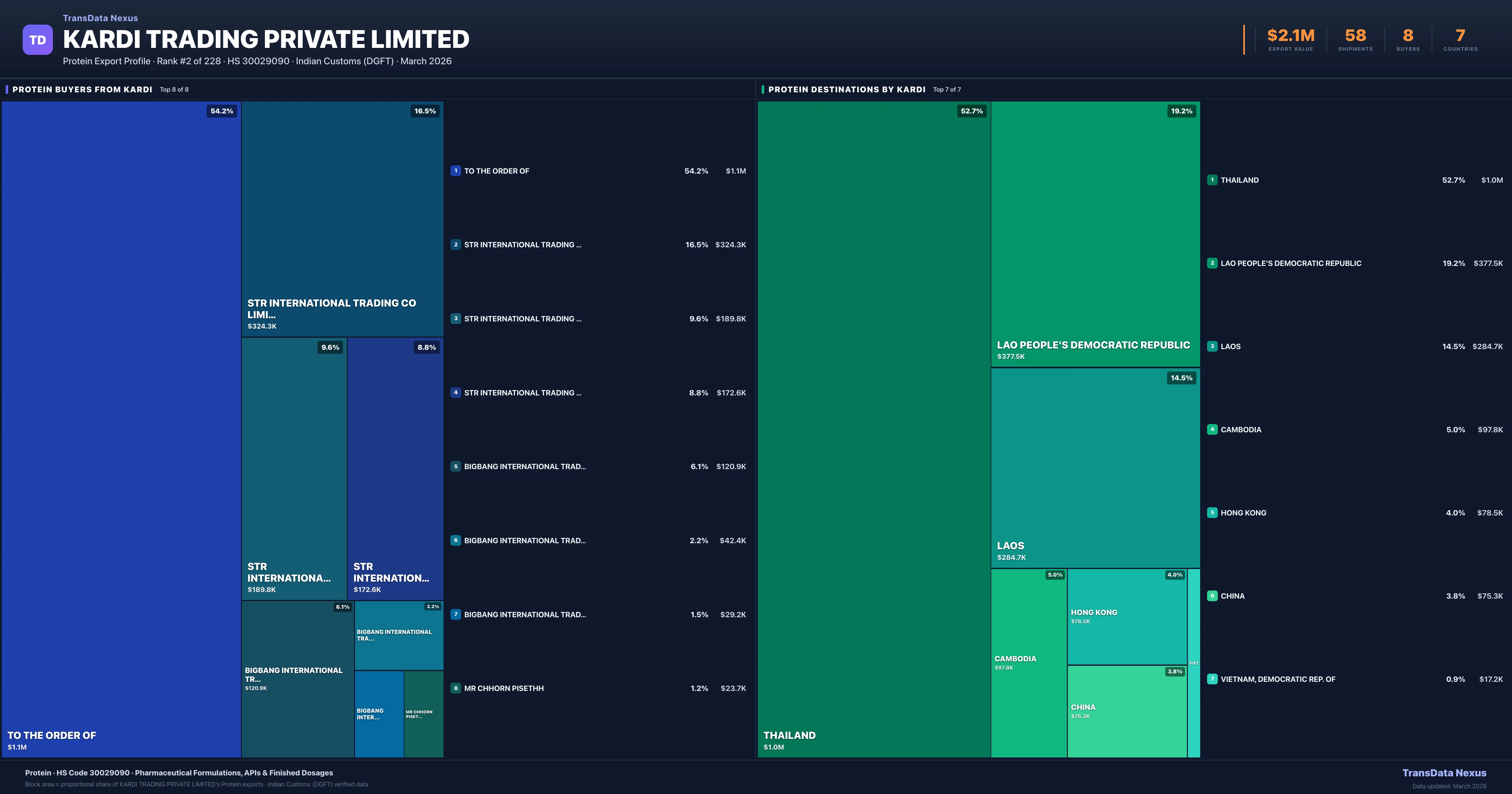 Kardi Trading Private Limited supplies Protein to 8 buyers globally. The largest buyer is TO THE ORDER OF (LAO PEOPLE'S DEMOCRATIC REPUBLIC), followed by STR INTERNATIONAL TRADING CO LIMITED PHUM TOUL (THAILAND) and STR INTERNATIONAL TRADING CO LIMITED (THAILAND). These buyers represent pharmaceutical distributors, hospital groups, and government procurement agencies in their respective markets.