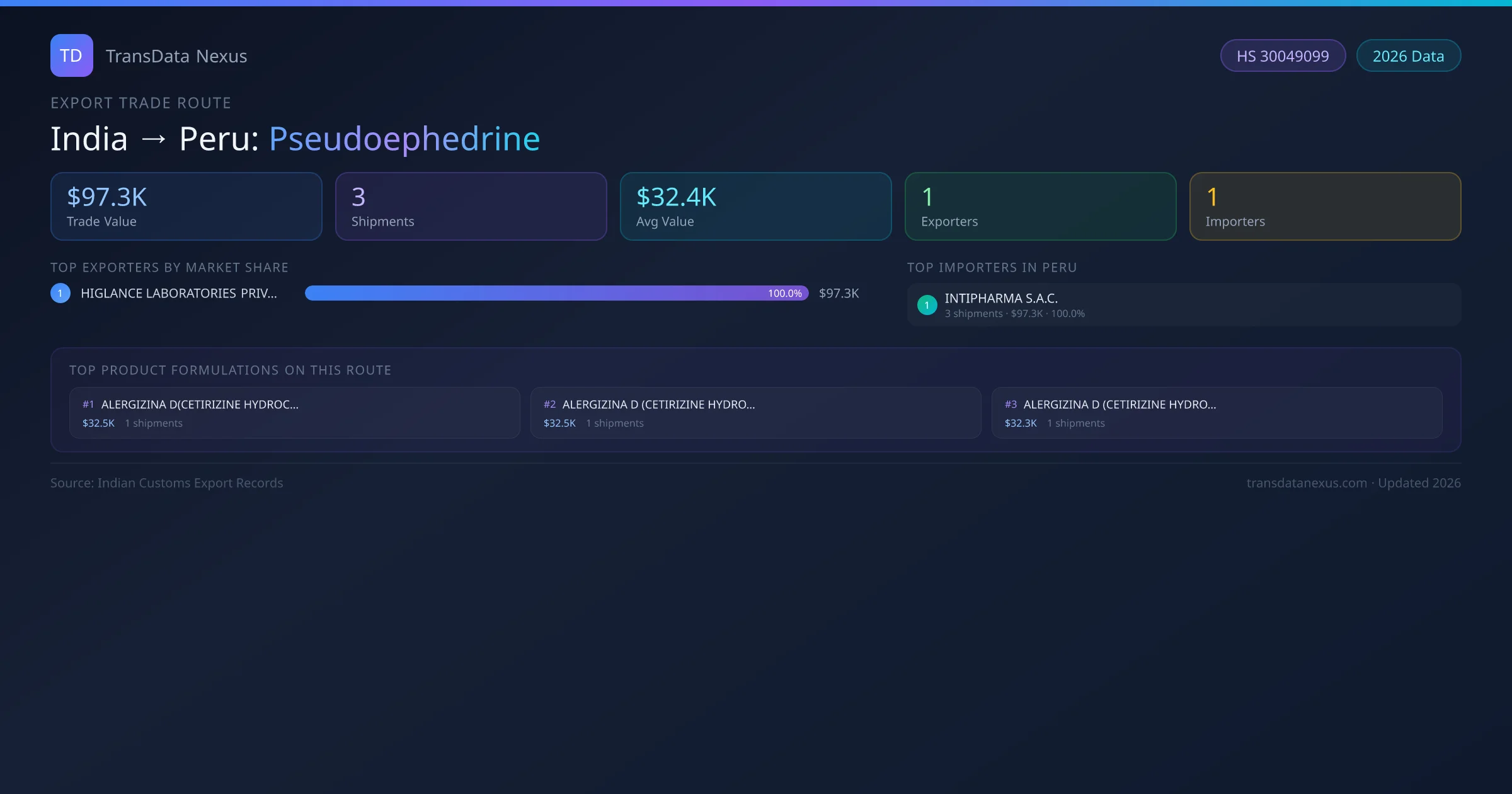 India has recorded 3 verified shipments of Pseudoephedrine exported to Peru, representing a combined trade value of $97.3K USD. This corridor is served by 1 active Indian exporters, with an average shipment value of $32.4K USD. The leading Indian exporter is HIGLANCE LABORATORIES PRIVATE LIMITED, which accounts for 100% of total export value with 3 shipments worth $97.3K USD. On the buying side, INTIPHARMA S.A.C. is the largest importer in Peru with $97.3K USD in purchases. All data sourced from Indian Customs (DGFT) shipping bill records. Values reported in FOB USD.