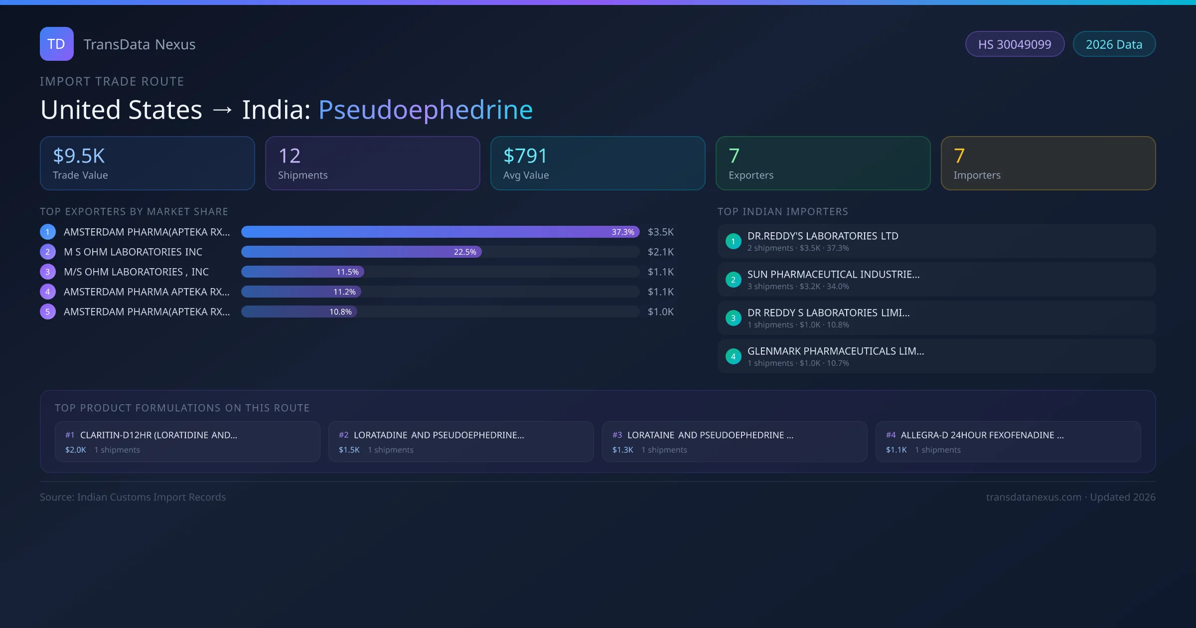 On the buying side, DR.REDDY'S LABORATORIES LTD is the largest importer with 2 shipments worth $3.5K USD — representing 37% of all pseudoephedrine imports from United States on this route. A total of 7 buyers are active on this corridor.