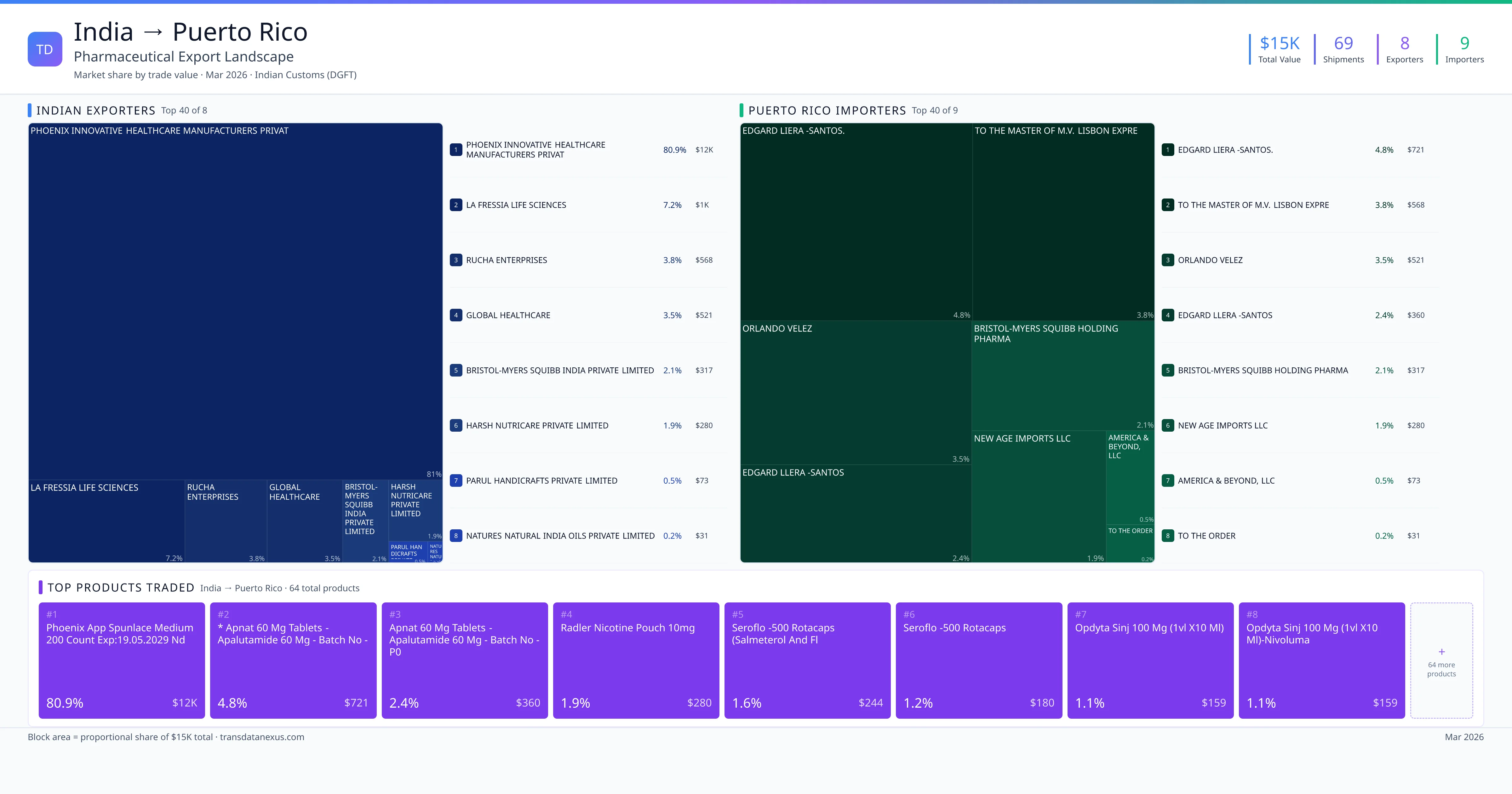 India imported $45.3M worth of pharmaceutical formulations from Puerto Rico across 134 verified shipments, from 16 foreign suppliers to 12 Indian buyers. The top suppliers are IPR PHARMACEUTICALS INC ($35.0M) and ASTRAZENECA UK LTD ($1.0M). The leading products are Calcium ($21.5M) and Rosuvastatin ($21.5M). Average shipment value: $338.0K.