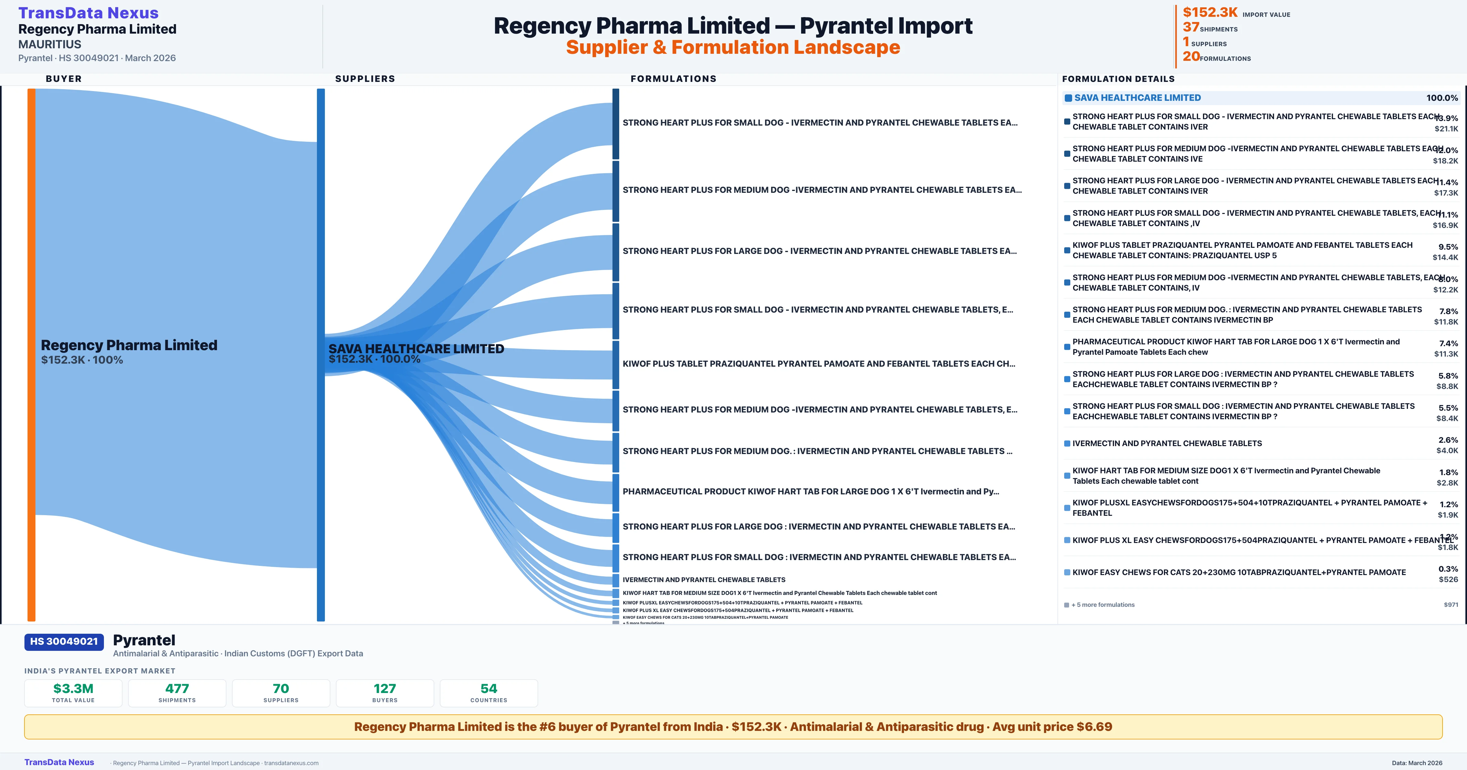 REGENCY PHARMA LIMITED sources Pyrantel from 1 verified Indian supplier: SAVA HEALTHCARE LIMITED ($152.3K, 100.0%). This is based on 37 customs records.