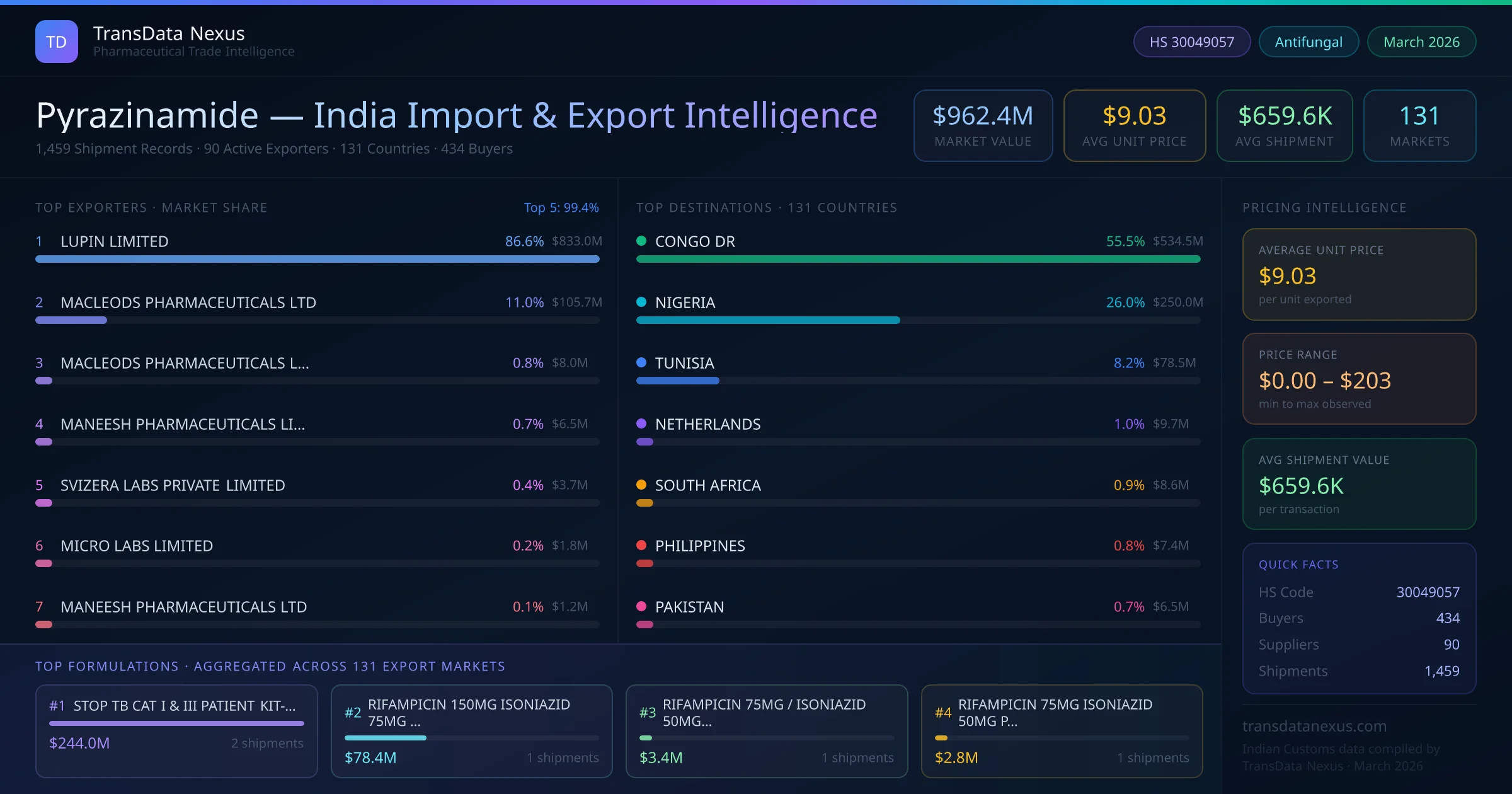 Between 2022 and 2026, India exported $962.4M worth of pyrazinamide across 1,459 verified shipments to 131 countries — covering 67% of world markets in the Tuberculosis Medications segment. The largest destination is CONGO DR (55.5%). LUPIN LIMITED leads with a 86.6% share. All figures are drawn from Indian Customs (DGFT) shipping bill records spanning four years of trade activity.
