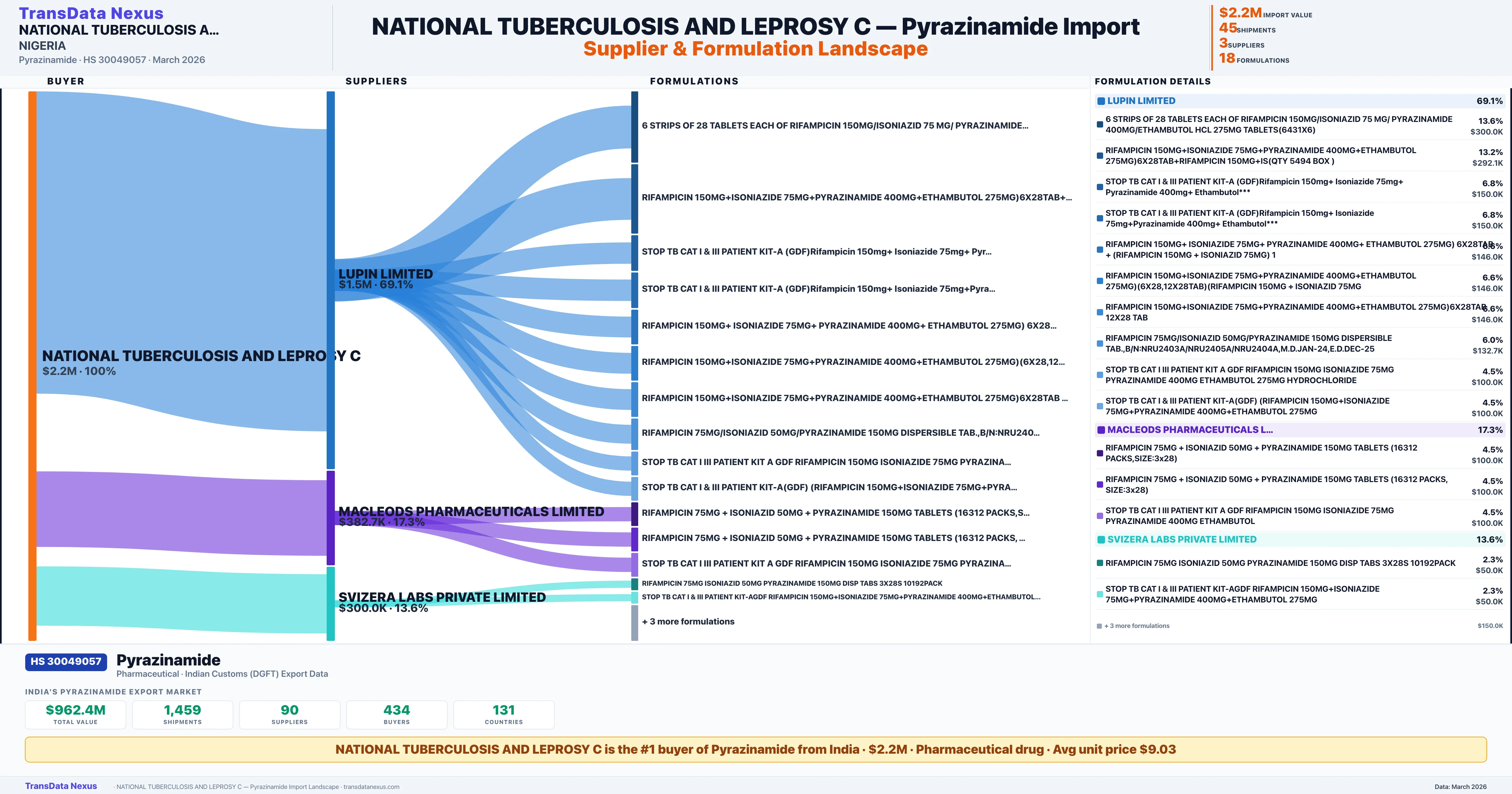 NATIONAL TUBERCULOSIS AND LEPROSY C is the #14 importer of Pyrazinamide from India with $2.2M in import value and 45 verified shipments. NATIONAL TUBERCULOSIS AND LEPROSY C holds a 2.4% market share in Pyrazinamide imports based in NIGERIA. The company sources from 3 verified suppliers across 18 formulations shipped to 2 countries.