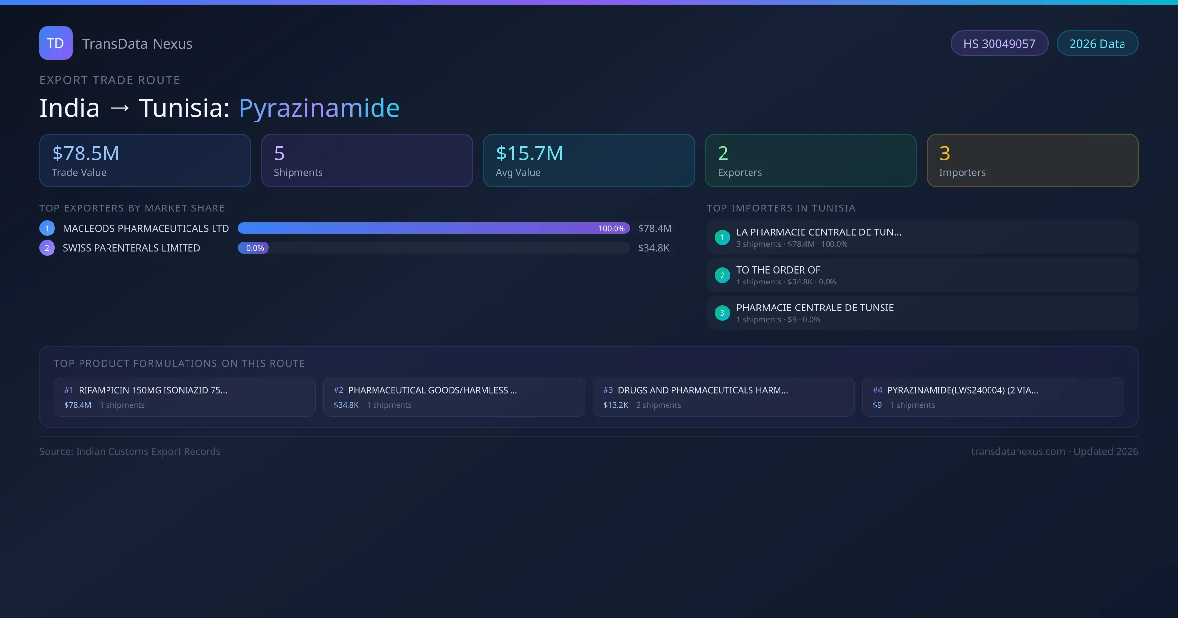 - 1.Route Identification: India to Tunisia export trade corridor identified from Indian Customs (DGFT) records for Pyrazinamide.