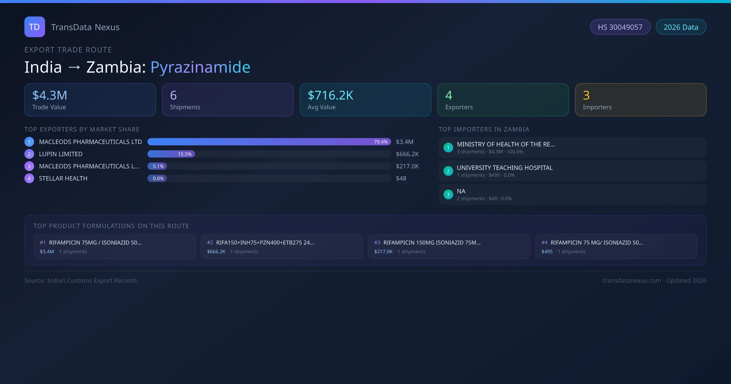 India has recorded 6 verified shipments of Pyrazinamide exported to Zambia, representing a combined trade value of $4.3M USD. This corridor is served by 4 active Indian exporters, with an average shipment value of $716.2K USD. The leading Indian exporter is MACLEODS PHARMACEUTICALS LTD, which accounts for 79% of total export value with 2 shipments worth $3.4M USD. On the buying side, MINISTRY OF HEALTH OF THE REPUBLIC is the largest importer in Zambia with $4.3M USD in purchases. The top 3 suppliers — MACLEODS PHARMACEUTICALS LTD, LUPIN LIMITED, MACLEODS PHARMACEUTICALS LIMITED — together control 100% of total trade value on this route. All data sourced from Indian Customs (DGFT) shipping bill records. Values reported in FOB USD.
