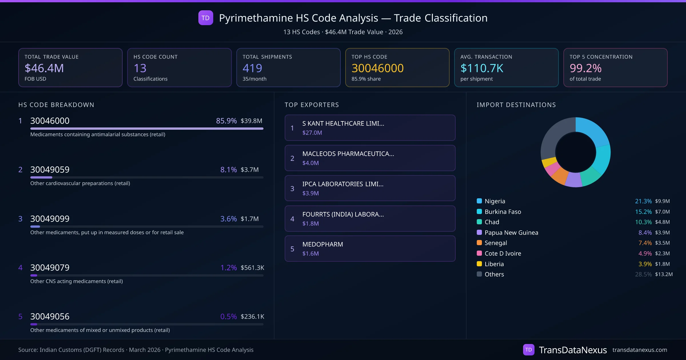 Pyrimethamine, classified under HS code 30046000, is subject to varying tariff rates in our primary importing countries: Nigeria, Burkina Faso, Chad, Papua New Guinea, Senegal, CΓ΄te d'Ivoire, Liberia, and Tanzania.