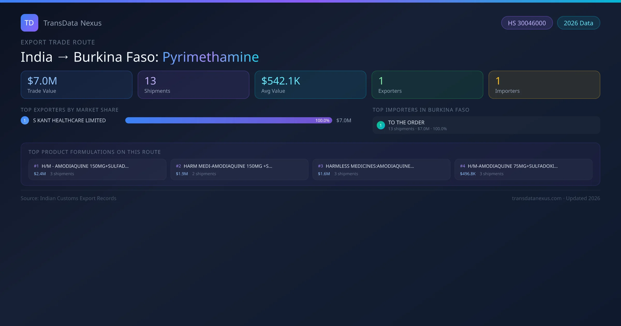 The India to Burkina Faso Pyrimethamine corridor is one of India's established pharmaceutical export routes, with 13 shipments documented worth a combined $7.0M USD. The route is dominated by S KANT HEALTHCARE LIMITED, which alone accounts for roughly 100% of all export value, reflecting the consolidated nature of India's pyrimethamine manufacturing sector.
