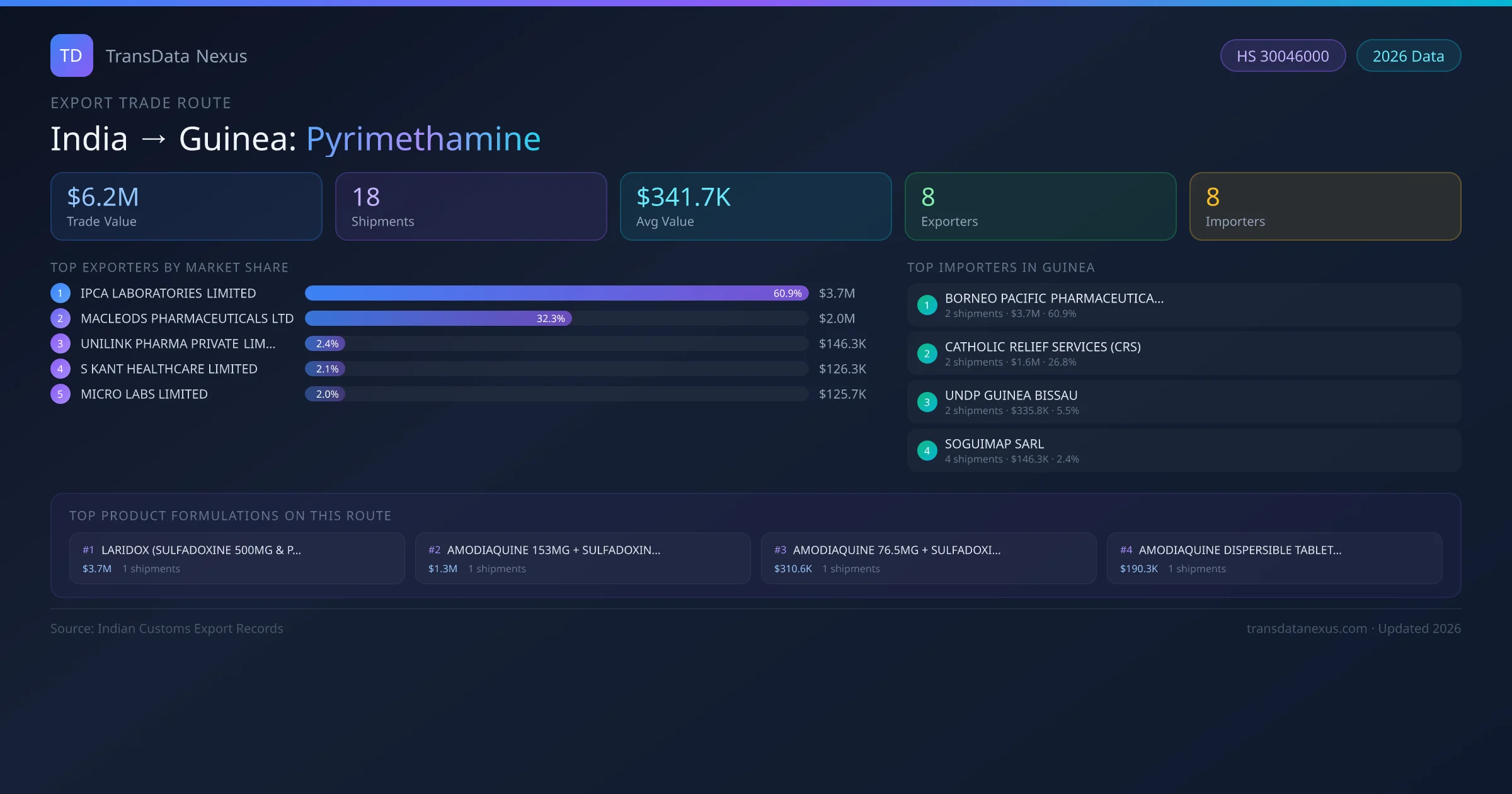 India has recorded 18 verified shipments of Pyrimethamine exported to Guinea, representing a combined trade value of $6.2M USD. This corridor is served by 8 active Indian exporters, with an average shipment value of $341.7K USD. The leading Indian exporter is IPCA LABORATORIES LIMITED, which accounts for 61% of total export value with 2 shipments worth $3.7M USD. On the buying side, BORNEO PACIFIC PHARMACEUTICALS LTD is the largest importer in Guinea with $3.7M USD in purchases. The top 3 suppliers — IPCA LABORATORIES LIMITED, MACLEODS PHARMACEUTICALS LTD, UNILINK PHARMA PRIVATE LIMITED — together control 96% of total trade value on this route. All data sourced from Indian Customs (DGFT) shipping bill records. Values reported in FOB USD.