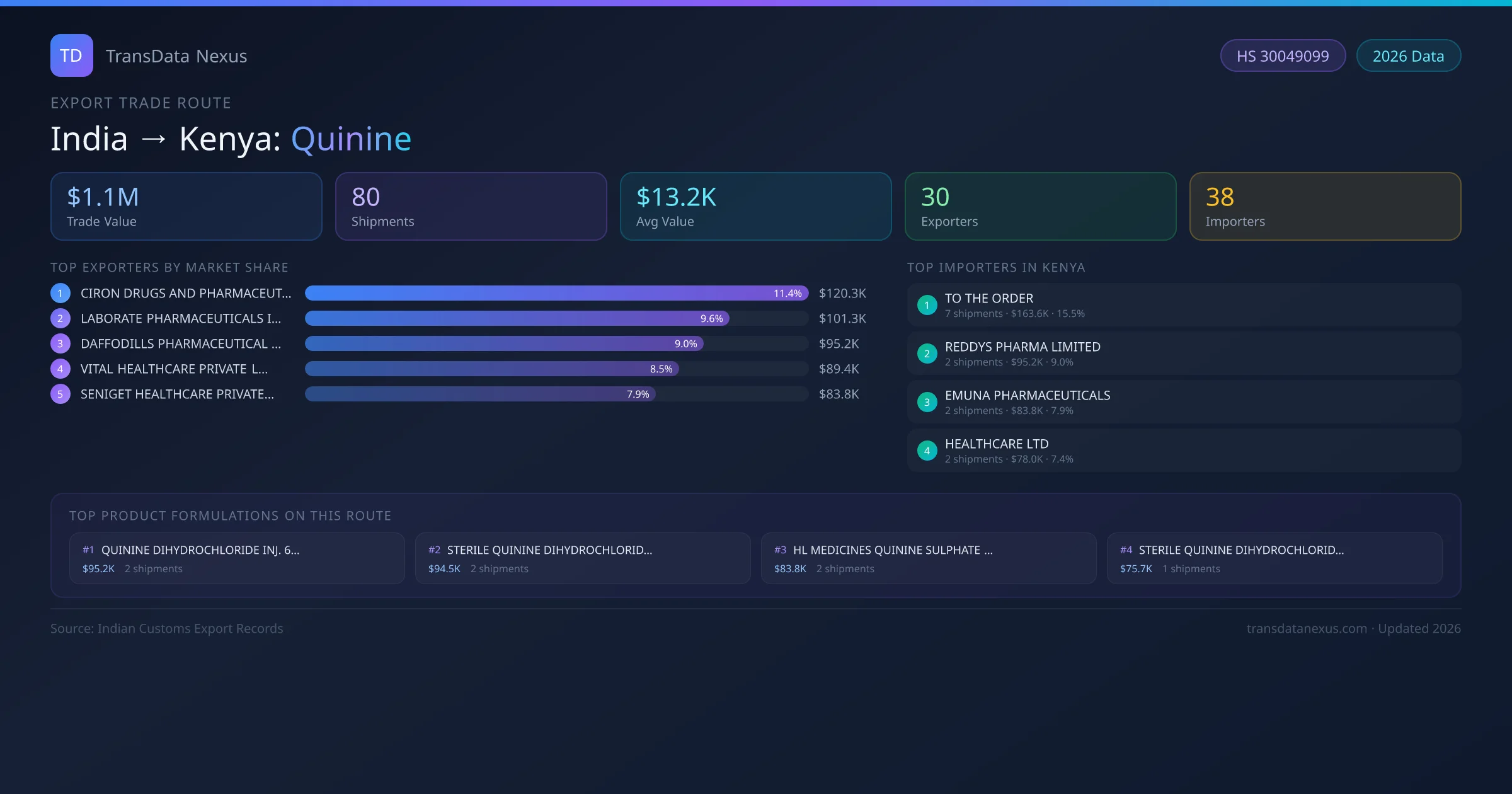 The India to Kenya Quinine corridor is one of India's established pharmaceutical export routes, with 80 shipments documented worth a combined $1.1M USD. The route is dominated by CIRON DRUGS AND PHARMACEUTICALS PRIVATE LIMITED, which alone accounts for roughly 11% of all export value, reflecting the consolidated nature of India's quinine manufacturing sector.