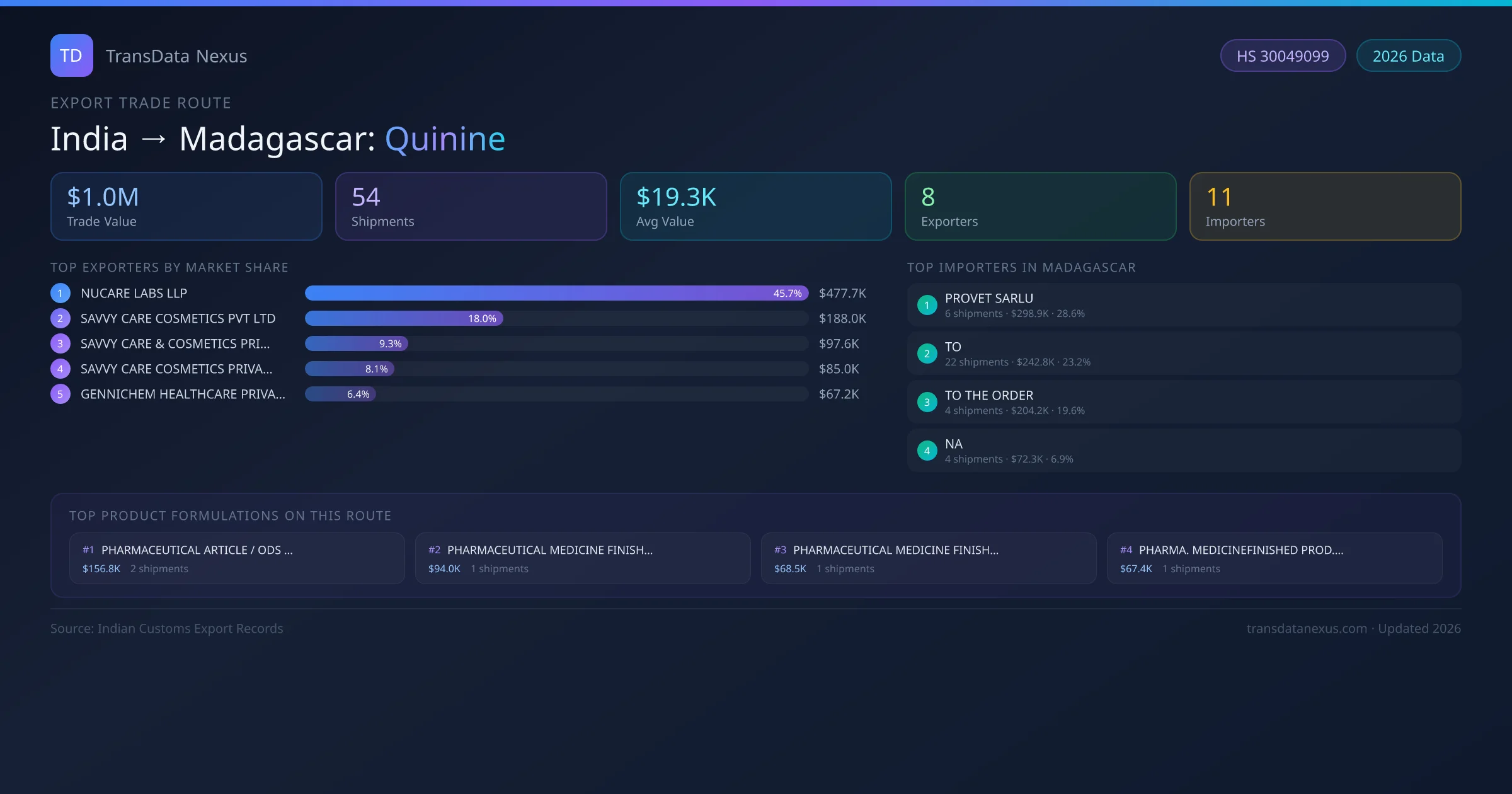 The India to Madagascar Quinine corridor is one of India's established pharmaceutical export routes, with 54 shipments documented worth a combined $1.0M USD. The route is dominated by NUCARE LABS LLP, which alone accounts for roughly 46% of all export value, reflecting the consolidated nature of India's quinine manufacturing sector.