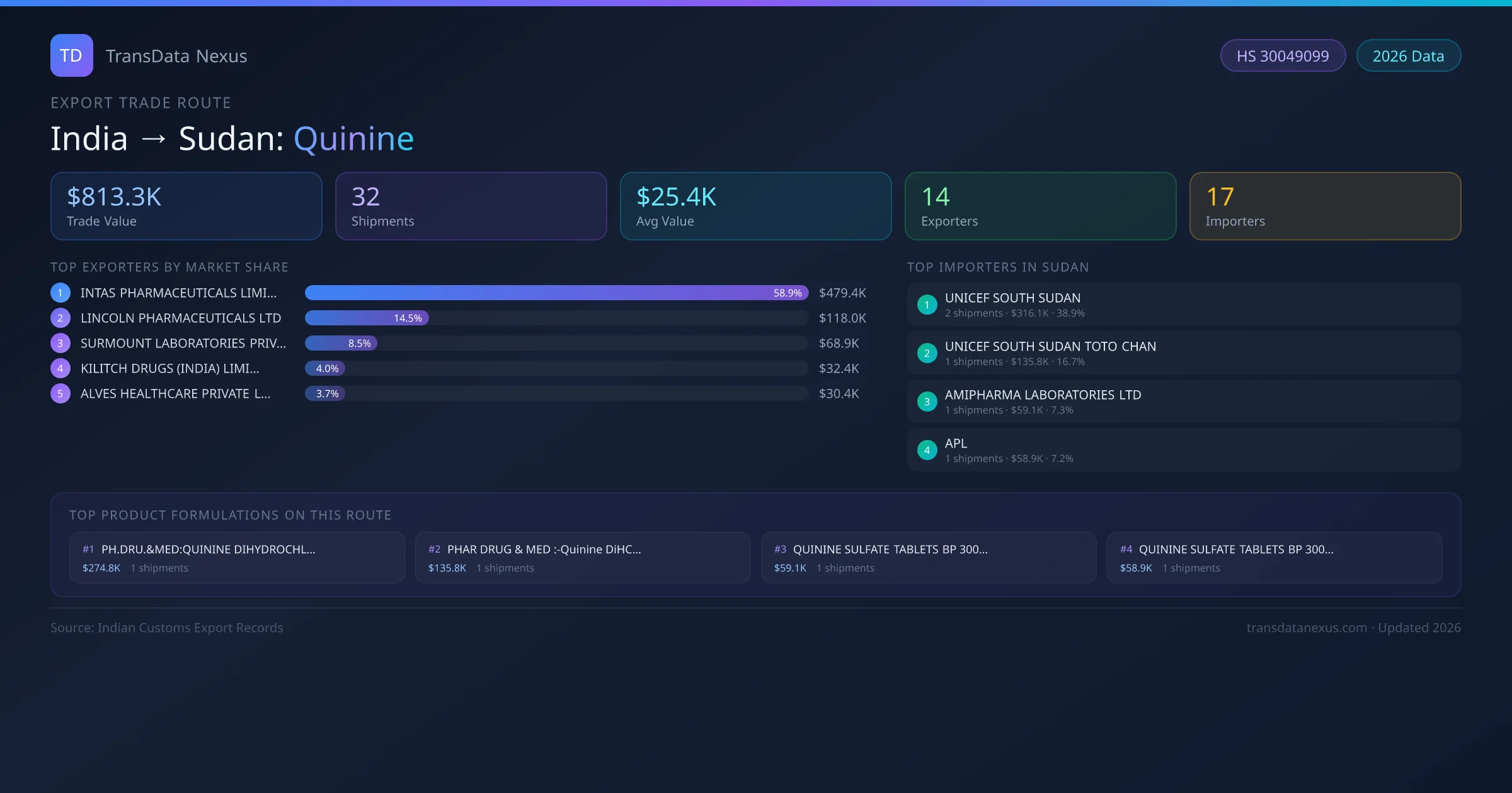 India has recorded 32 verified shipments of Quinine exported to Sudan, representing a combined trade value of $813.3K USD. This corridor is served by 14 active Indian exporters, with an average shipment value of $25.4K USD. The leading Indian exporter is INTAS PHARMACEUTICALS LIMITED, which accounts for 59% of total export value with 4 shipments worth $479.4K USD. On the buying side, UNICEF SOUTH SUDAN is the largest importer in Sudan with $316.1K USD in purchases. The top 3 suppliers — INTAS PHARMACEUTICALS LIMITED, LINCOLN PHARMACEUTICALS LTD, SURMOUNT LABORATORIES PRIVATE LIMITED — together control 82% of total trade value on this route. All data sourced from Indian Customs (DGFT) shipping bill records. Values reported in FOB USD.