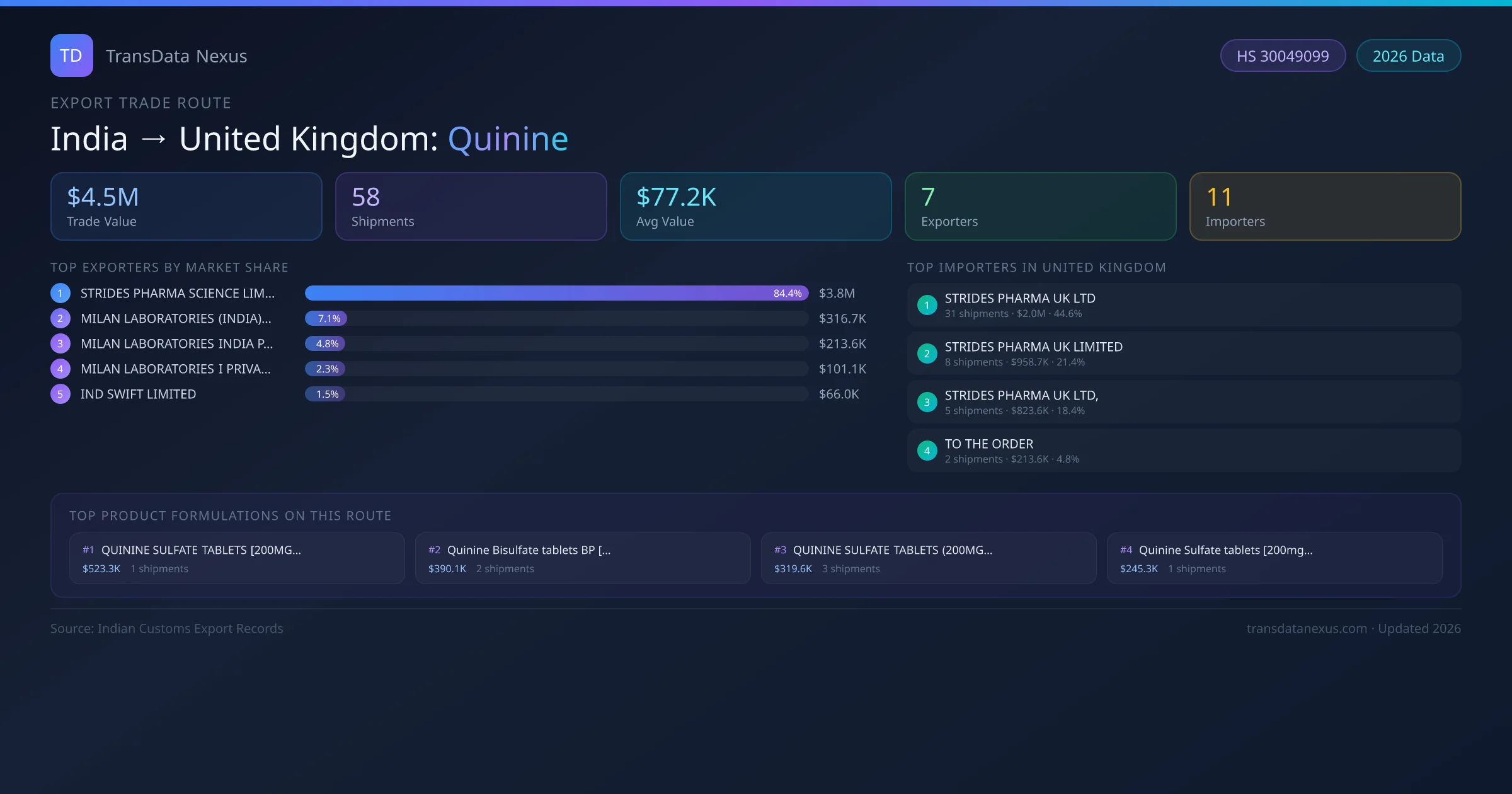 India has recorded 58 verified shipments of Quinine exported to United Kingdom, representing a combined trade value of $4.5M USD. This corridor is served by 7 active Indian exporters, with an average shipment value of $77.2K USD. The leading Indian exporter is STRIDES PHARMA SCIENCE LIMITED, which accounts for 84% of total export value with 44 shipments worth $3.8M USD. On the buying side, STRIDES PHARMA UK LTD is the largest importer in United Kingdom with $2.0M USD in purchases. The top 3 suppliers — STRIDES PHARMA SCIENCE LIMITED, MILAN LABORATORIES (INDIA) PRIVATE LIMITED, MILAN LABORATORIES INDIA PRIVATE LIMITED — together control 96% of total trade value on this route. All data sourced from Indian Customs (DGFT) shipping bill records. Values reported in FOB USD.