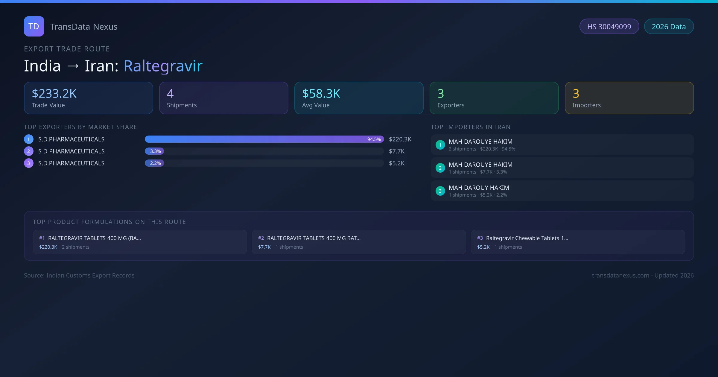 - 1.Route Identification: India to Iran export trade corridor identified from Indian Customs (DGFT) records for Raltegravir.